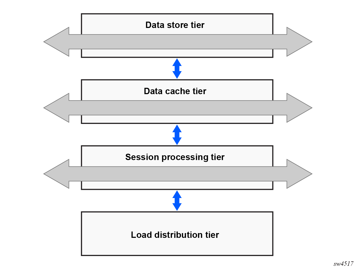 Both the data store and data cache are responsible for storing state information and scale dynamically based on performance and subscriber scale. The data store is intended to store more permanent data such as configurations, while the data cache is for transient data such as the DHCP lease of a subscriber. The session processing tier handles processing of the subscriber session which scales according to the subscriber footprint. The load distribution tier serves as a load balancer for all incoming control messages.