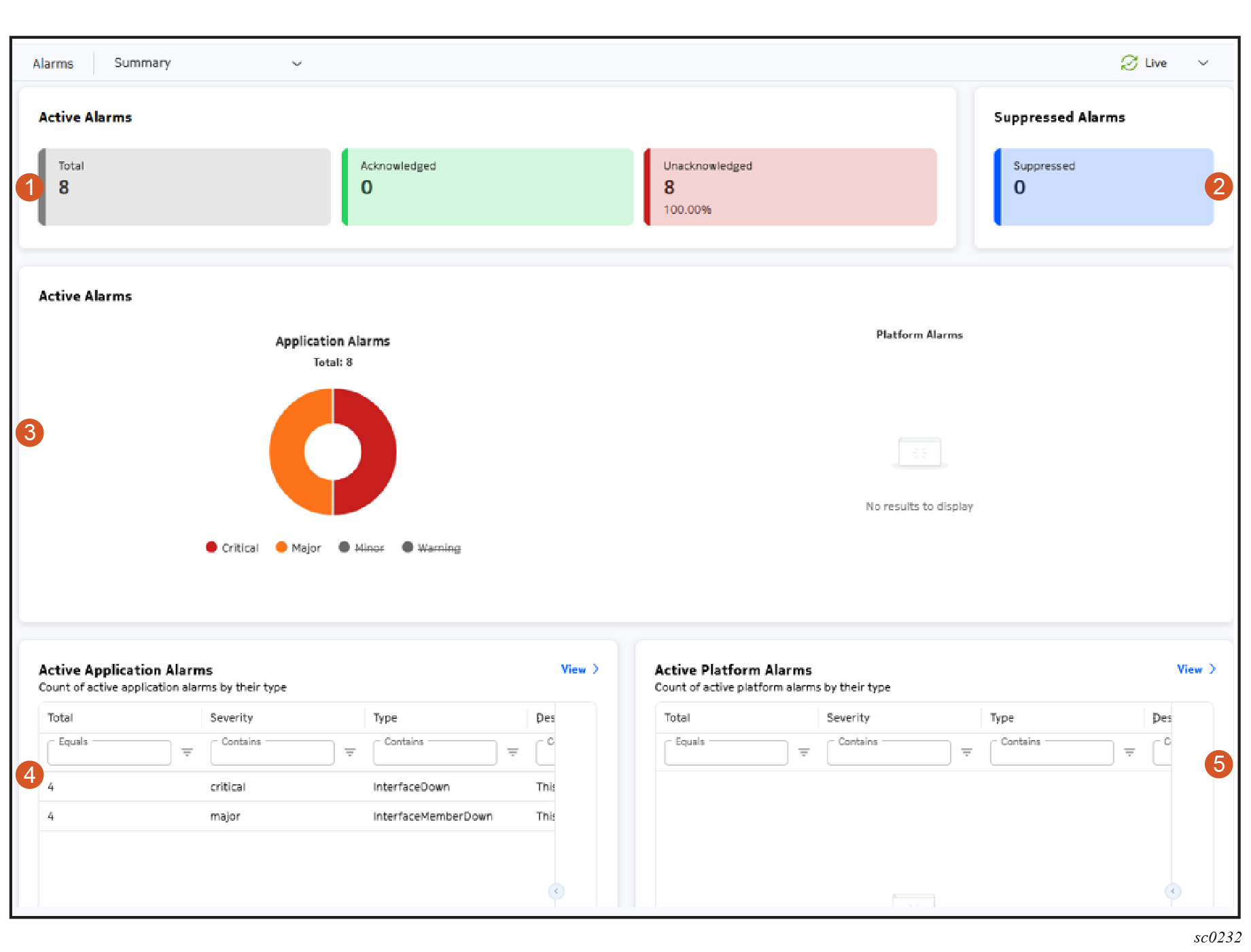 | 3 | Active Alarms charts | The Active Alarms charts dashlet breaks the Application Alarm and Platform Alarm counts down by severity and displays them in charts. |