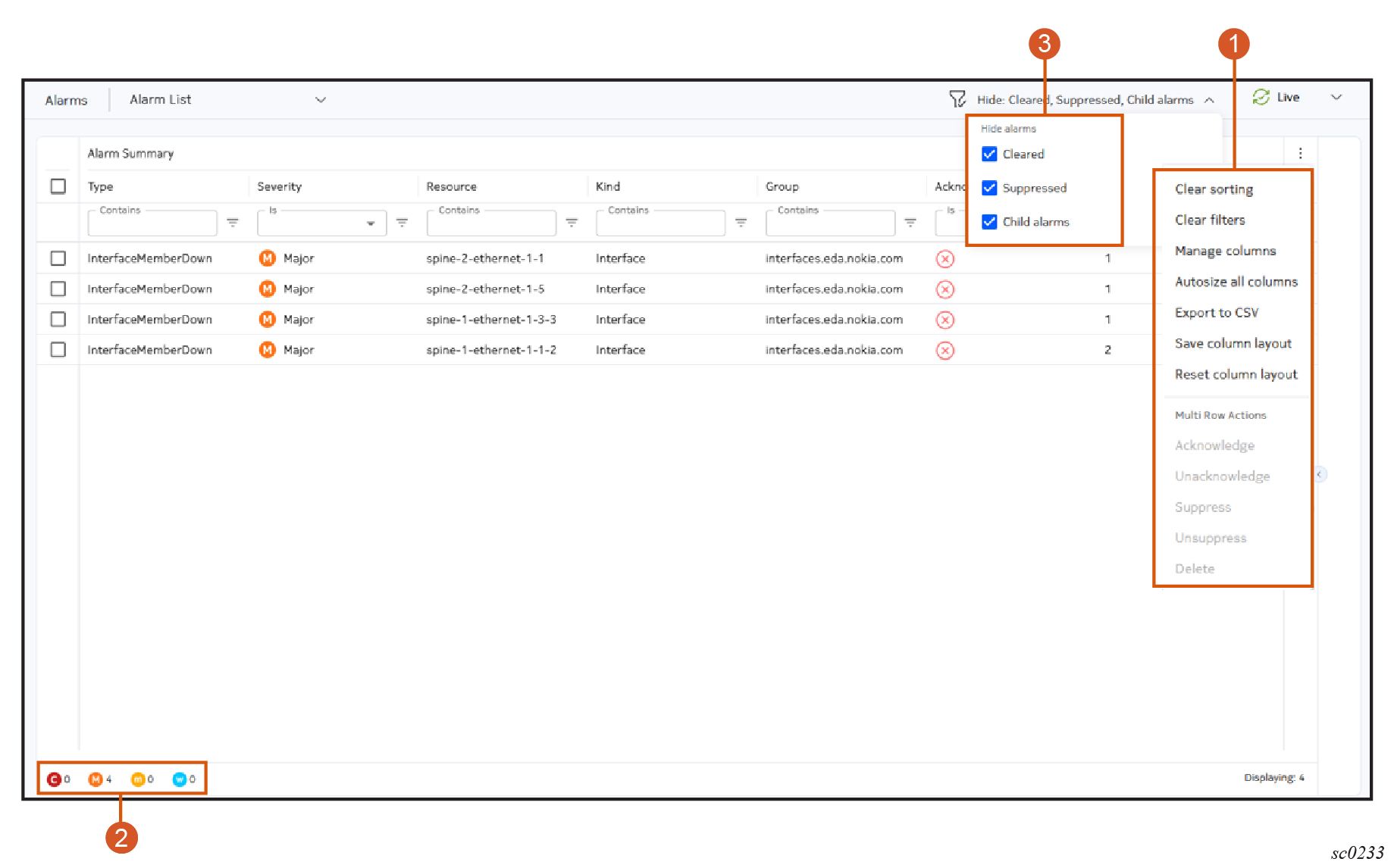 | 2 | Alarm count | Displays the number of current alarms of various severities. |