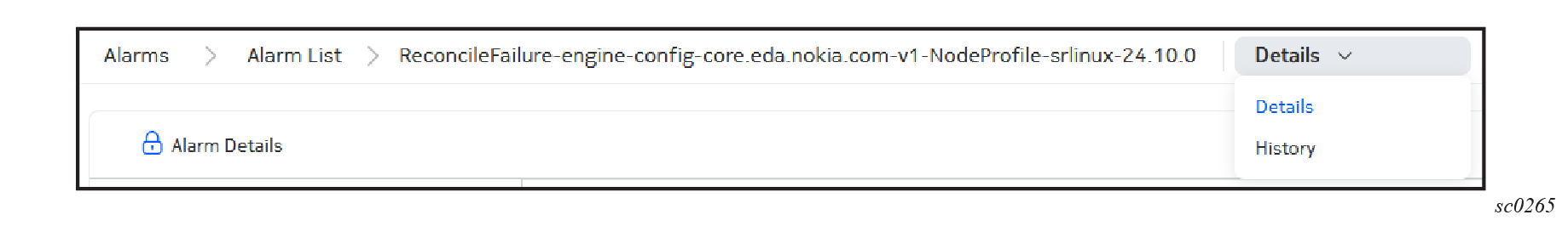 You can switch between the Alarm Details page and the Alarm History pages by selecting Details or History from the drop-down list at the upper right of the page.