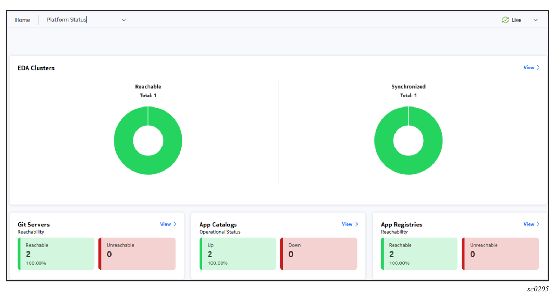 | Git servers | Shows the reachability status of EDA's Git servers. These servers are used for persistent storage of resources, installed apps, and user settings. |