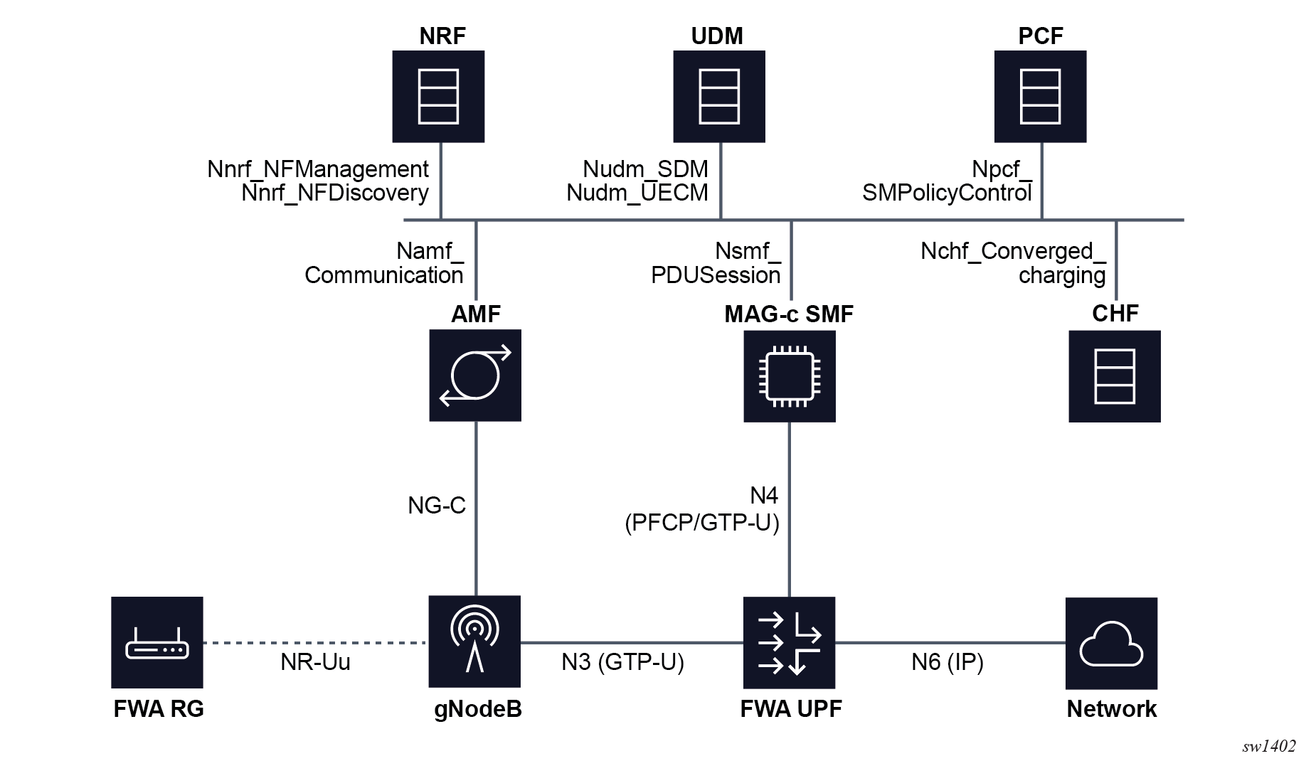 In general, any consumer can consume a service, subject to access control. This allows for easy extensibility and re-use. Examples of this are the Nnrf_NFDiscovery and Nnrf_NFManagement services, both of which are served by the NRF. These services are used by other NFs to discover other NFs and register themselves for discovery respectively. For this reason, a 5G core architecture is often presented in an alternative form where the focus is not on interfaces such as shown in Basic 5G FWA network but on the provided services. An example of such a representation is shown Basic 5G network with service representation. This representation also makes it clear that the SBA is focused on the control plane functions.