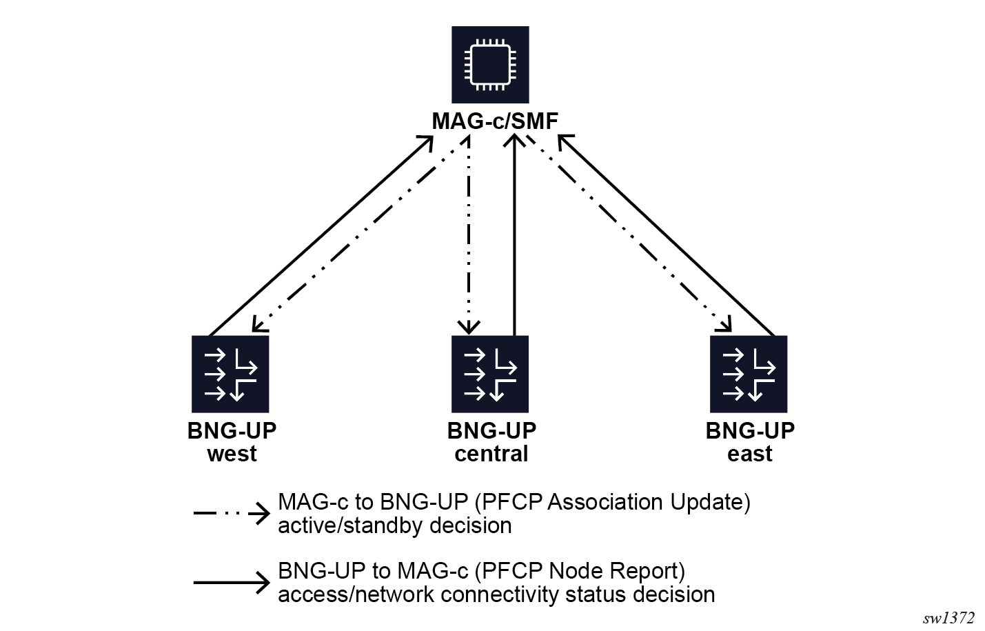 The Nokia MAG-c supports a MAG-c-driven BNG-UP resiliency scheme. In this scheme, the MAG-c selects the active and standby BNG-UPs and the BNG-UPs must follow this decision. The BNG-UPs do not communicate directly to negotiate the active or standby role or to synchronize session state. Instead, each BNG-UP sends its local status indicators to the MAG-c ; for example, whether it has full connectivity to the access network. The MAG-c aggregates these status indicators from all BNG-UPs and makes an informed decision that is sent to the BNG-UPs. The PFCP node messages of the PFCP association between the BNG-UP and MAG-c that are already in place for session management carry the status indicators and informed decisions.