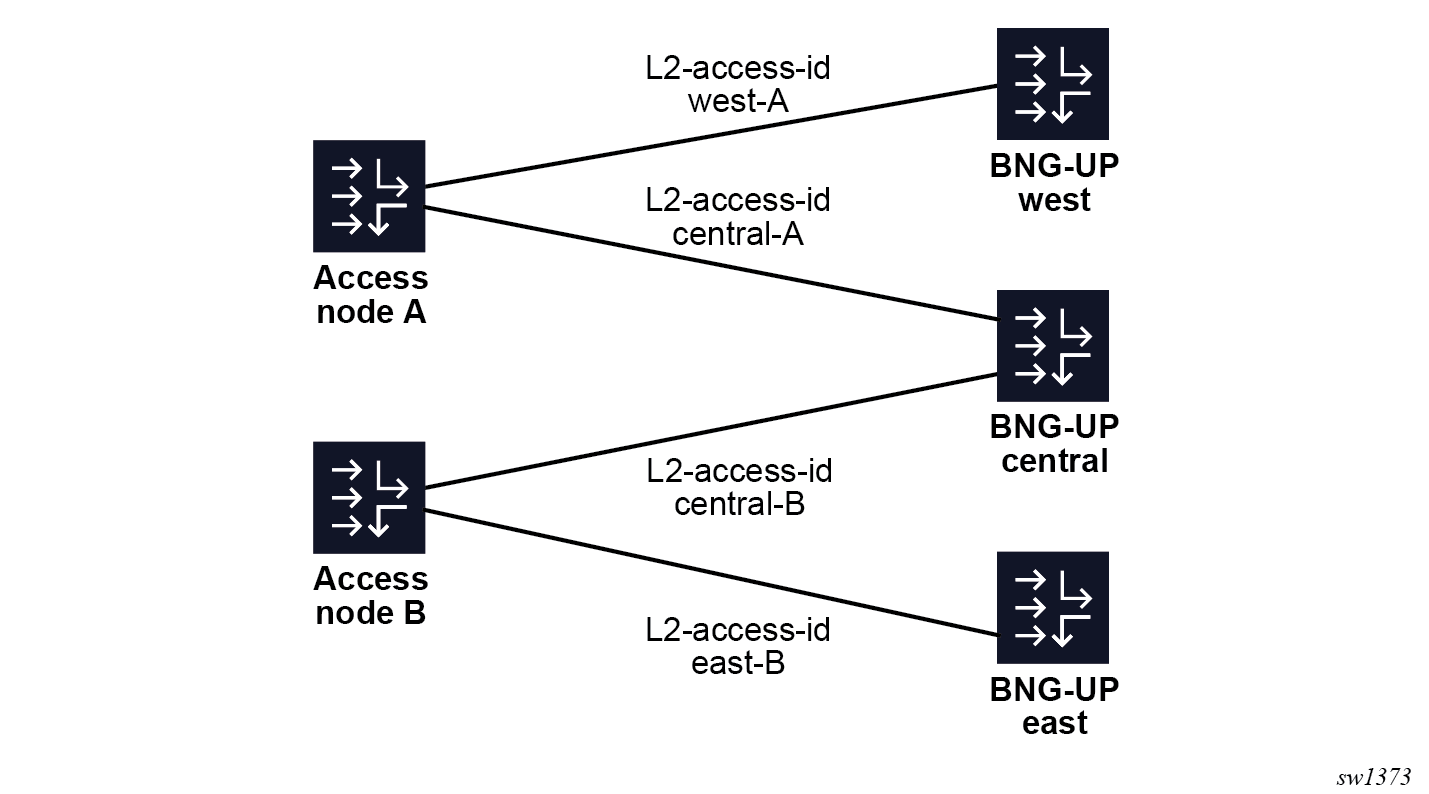 It is possible and often wanted that a BNG-UP is active for a subset of the sessions and standby for another subset of the sessions. For example, when two BNG-UPs are fully available, making both BNG-UPs active for half of the sessions and standby for the other half of the sessions may be preferred. Similarly, two Layer 2 access IDs (ports) on the same BNG-UP can be backed up by two different BNG-UPs. The following figure shows the use case where the BNG-UP "central" is backed up by both the BNG-UPs "west" and "east" for two different Layer 2 access IDs.
