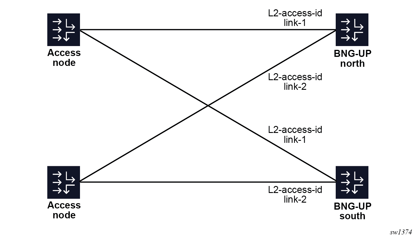 When all BNG-UPs use identical Layer 2 access IDs, it is possible to list multiple Layer 2 access IDs per UP group at the group level to avoid creating multiple UP groups for each Layer 2 access ID. When this is configured, the BNG-UP assumes that each Layer 2 access ID is backed up by the identically named Layer 2 access ID on other BNG-UPs. The MAG-c does not assume that there is one big broadcast domain shared between all ports. The following figure shows a UP group that covers two Layer 2 access IDs, named "link-1" and "link2". The sessions on "link-1" cannot be backed up on "link-2" because "link-2" connects to another access node.