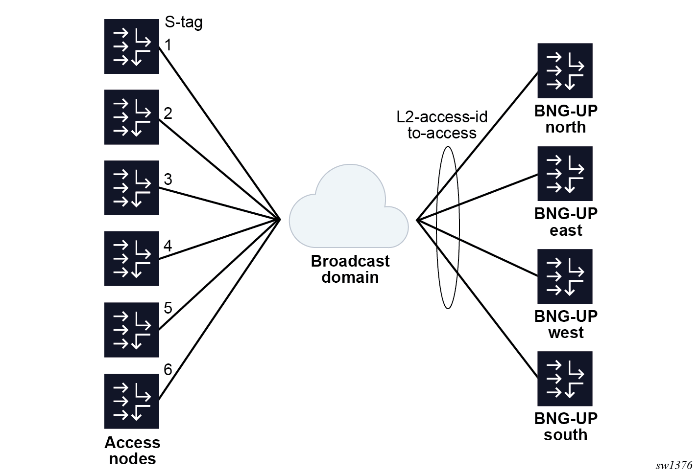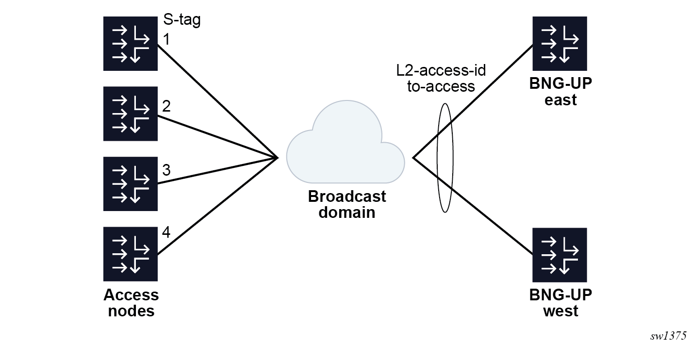 Four access nodes are connected to a pair of BNG-UPs using a shared broadcast domain. To simplify Layer 2 forwarding, each access node is assigned a unique S-tag. The broadcast domain is connected to each BNG-UP through an identically-named Layer 2 access ID on both BNG-UPs. The MAG-c makes abstraction of whether this connection is a port, LAG, BGP-VPLS, EVPN, or any similar construct.