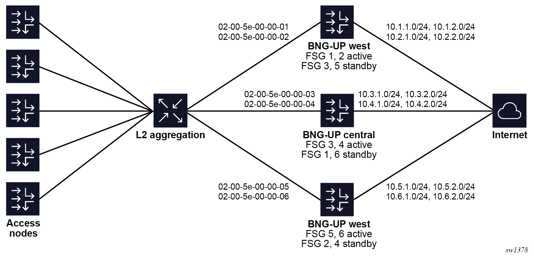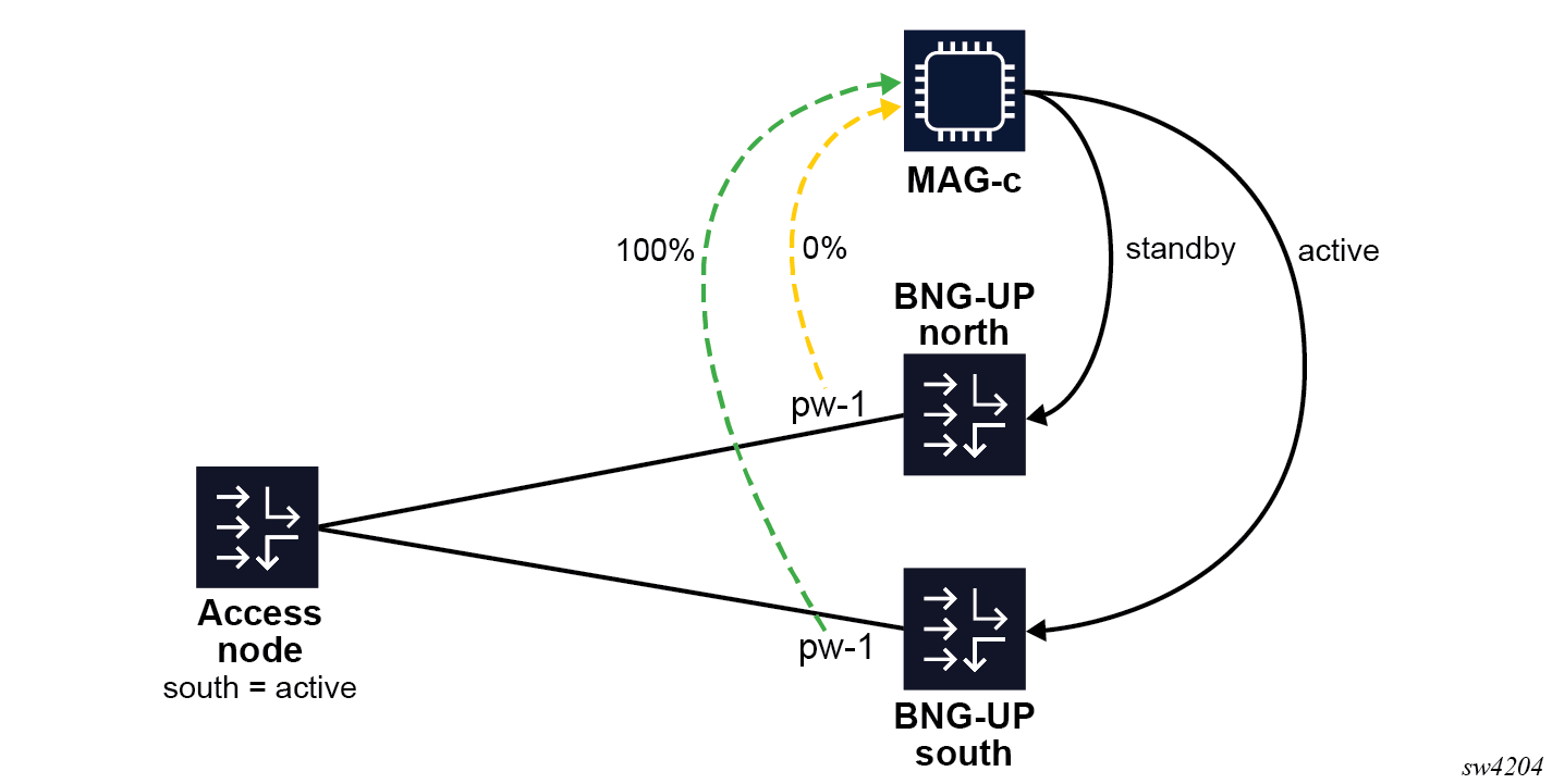 - Split a single Layer 2 access ID in multiple FSGs and set a different preferred status on different BNG-UPs. In stable conditions, this achieves active/active behavior where some sessions are active on one BNG-UP while others are active on another BNG-UP. See Example for a 1:1 hot standby resiliency with an S-tag per access node for this use case.