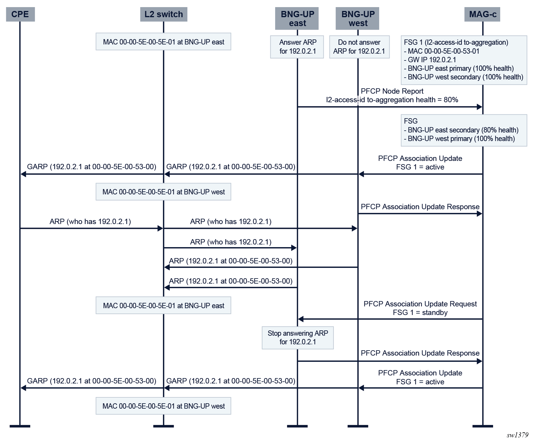 - When the standby BNG-UP confirms the FSG change, the MAG-c sends a second FSG update message to the active BNG-UP without changing anything. This can be done in parallel with the previous step. The second FSG update message may seem redundant, but is required to resolve a rare race condition in the GARP/ARP signaling for fixed access connections.