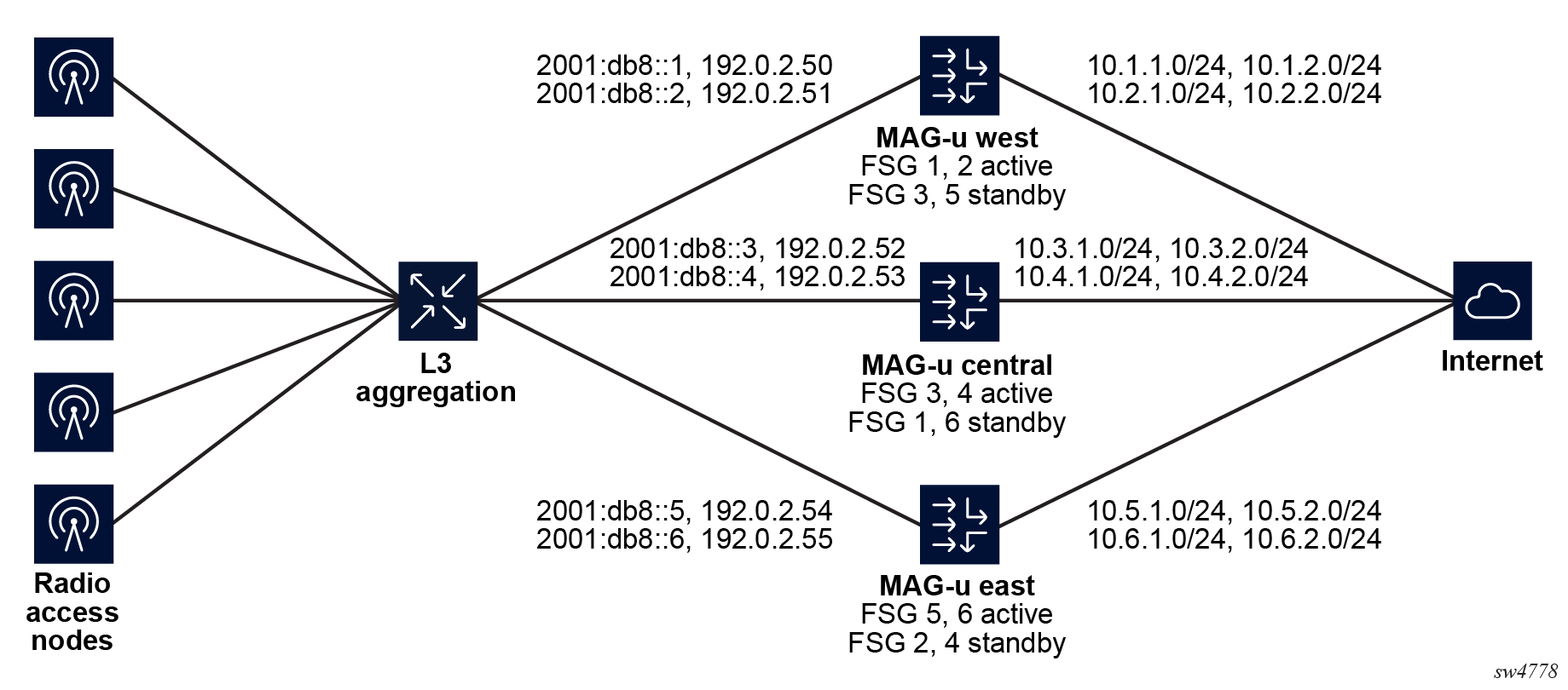 To support all use cases, the MAG-c assigns sessions to an FSG. The MAG-c assigns the active or standby state to each FSG. The state applies to all sessions of the FSG, but not to any other session on the same BNG-UPs. ODSA is also FSG-aware and allocates micro-nets on an FSG basis, instead of a BNG-UP basis, to account for FSGs moving between BNG-UPs.