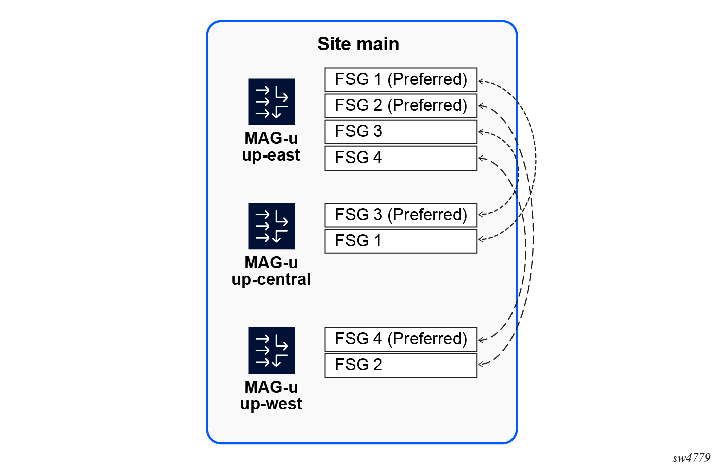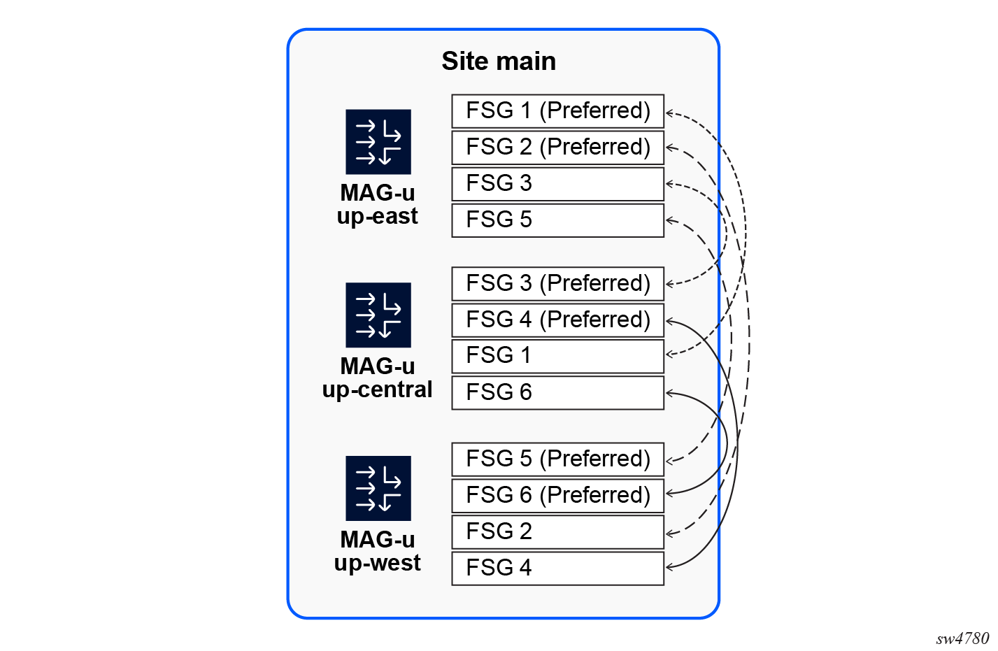- Configure a different BNG-UP as preferred in each group to make the associated FSG active on the preferred BNG-UP as long as that BNG-UP is healthy.