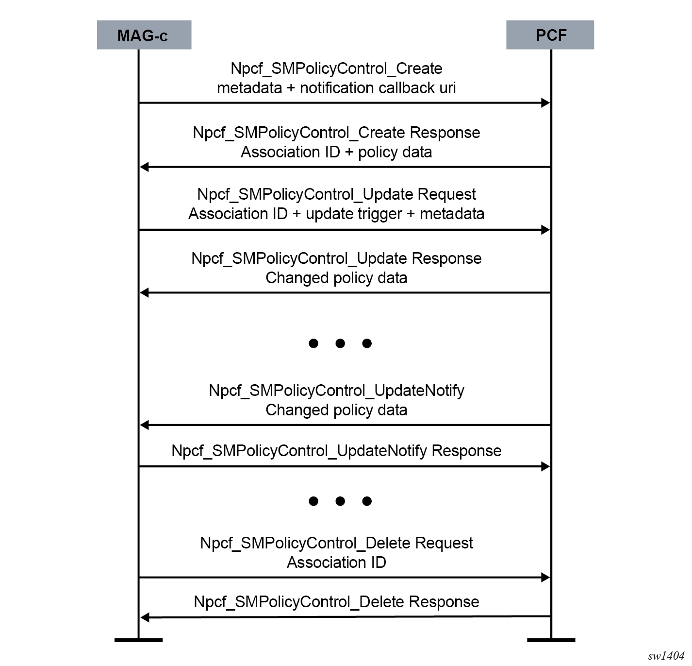 The Npcf_SMPolicyControl service creates a policy association for a session that can be updated or removed at any time. Each policy association has its own identifier assigned by the PCF, which may be different from MAG-c session-specific identifiers such as SUPI. The MAG-c supports the following operations of the Npcf_SMPolicyControl service, as shown in PCF Policy Control Operations: