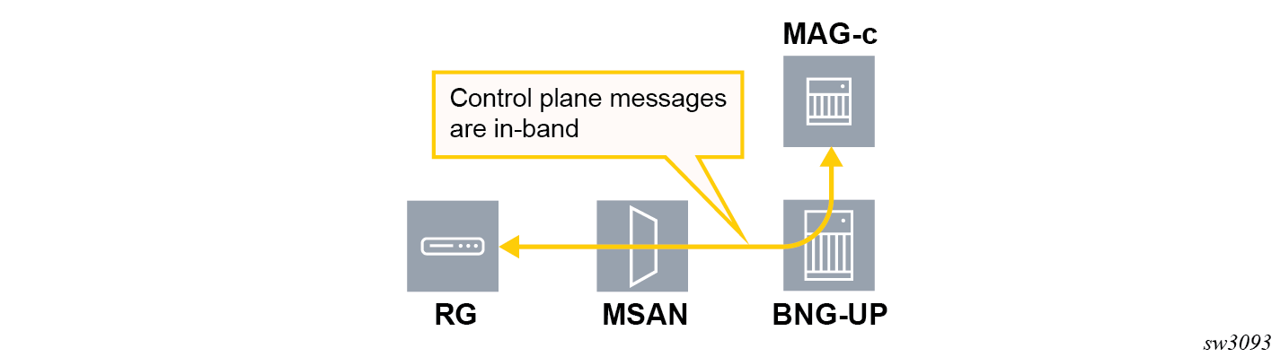 In-band control plane (IBCP) packets are sent by a residential gateway over the data path to the BNG-UP, but must be handled by the MAG-c. Examples include DHCP, DHCPv6, and ICMPv6 RS.