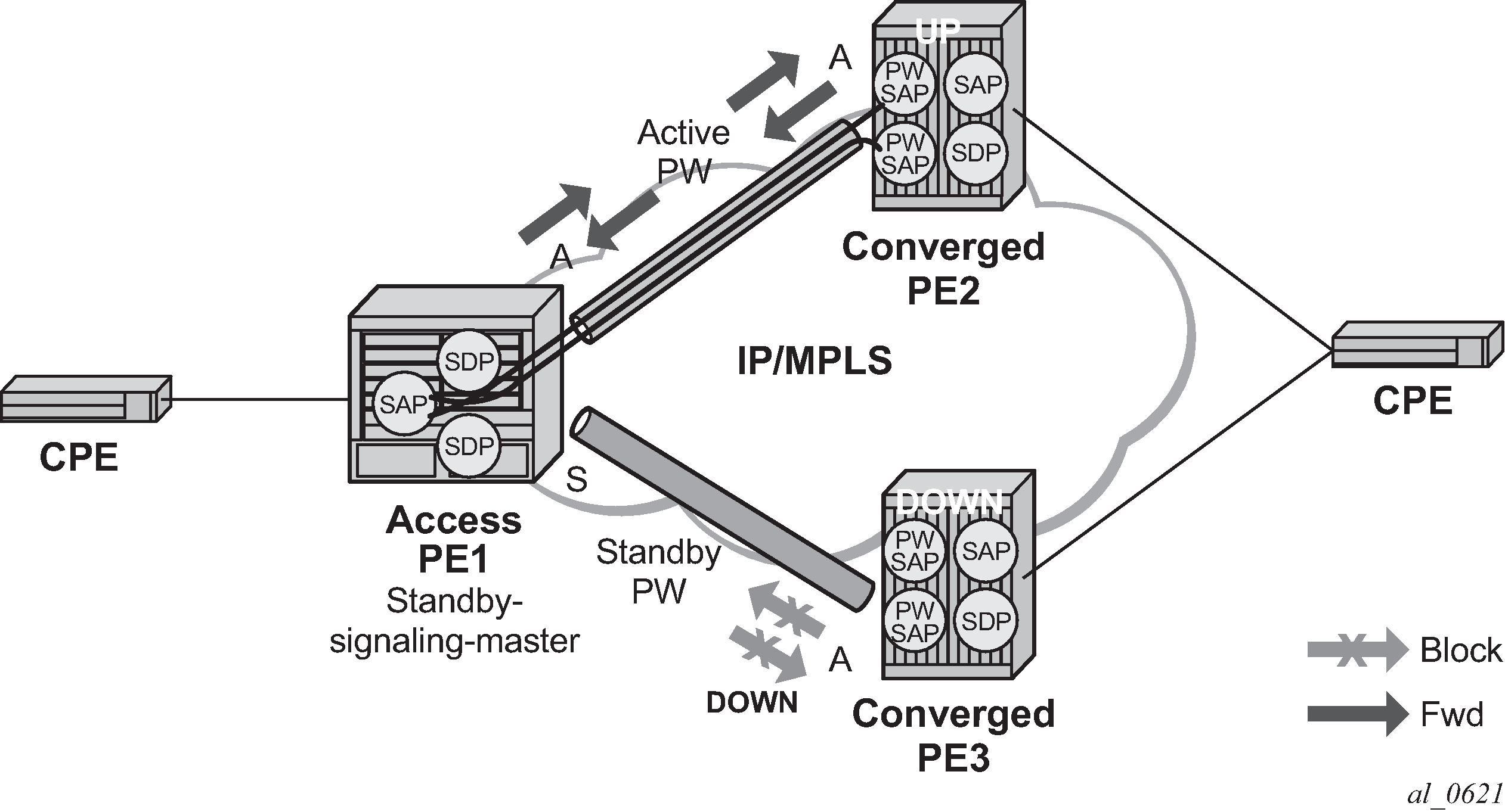 The packet is encapsulated on an Ethernet pseudowire, which is associated with a pseudowire port on the converged PE, and a spoke SDP on the access PE. The SDP could use an LDP LSP, RSVP LSP, segment routed tunnel, BGP RFC 8277 tunnel, or LDP over RSVP tunnel. Hash labels are not supported. The SDP may be bound to a port or a LAG, although shaping Vports for pseudowire ports on LAGs in distributed mode is not supported. If an SDP is rerouted, then the corresponding pseudowire ports are brought operationally down. Pseudowire ports are associated with an SDP by configuration.
