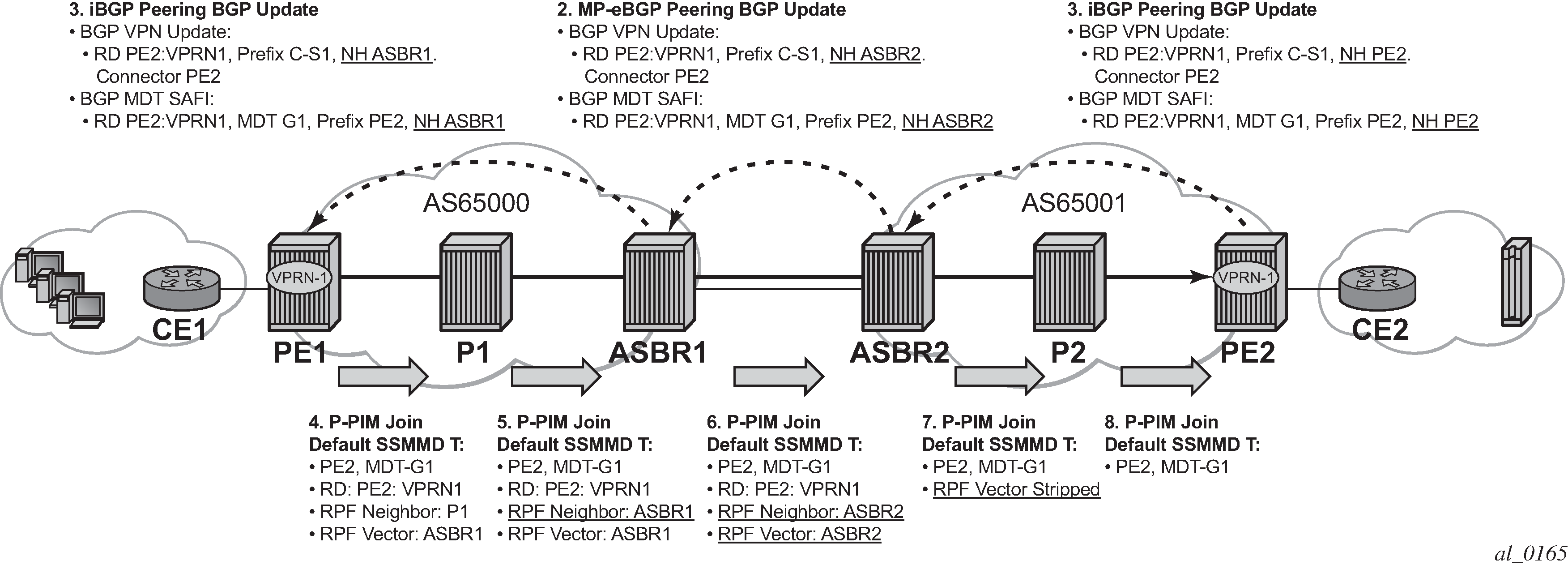 An ASBR that is neither a PE nor a route reflector that receives its best RTC route for a prefix from an EBGP peer re-advertises that route (subject to export policies) to its EBGP and IBGP peers. When re-advertised routes are sent to EBGP peers, the ASBR modifies the NEXT_HOP and AS_PATH per standard BGP rules. No aggregation of RTC routes is supported.