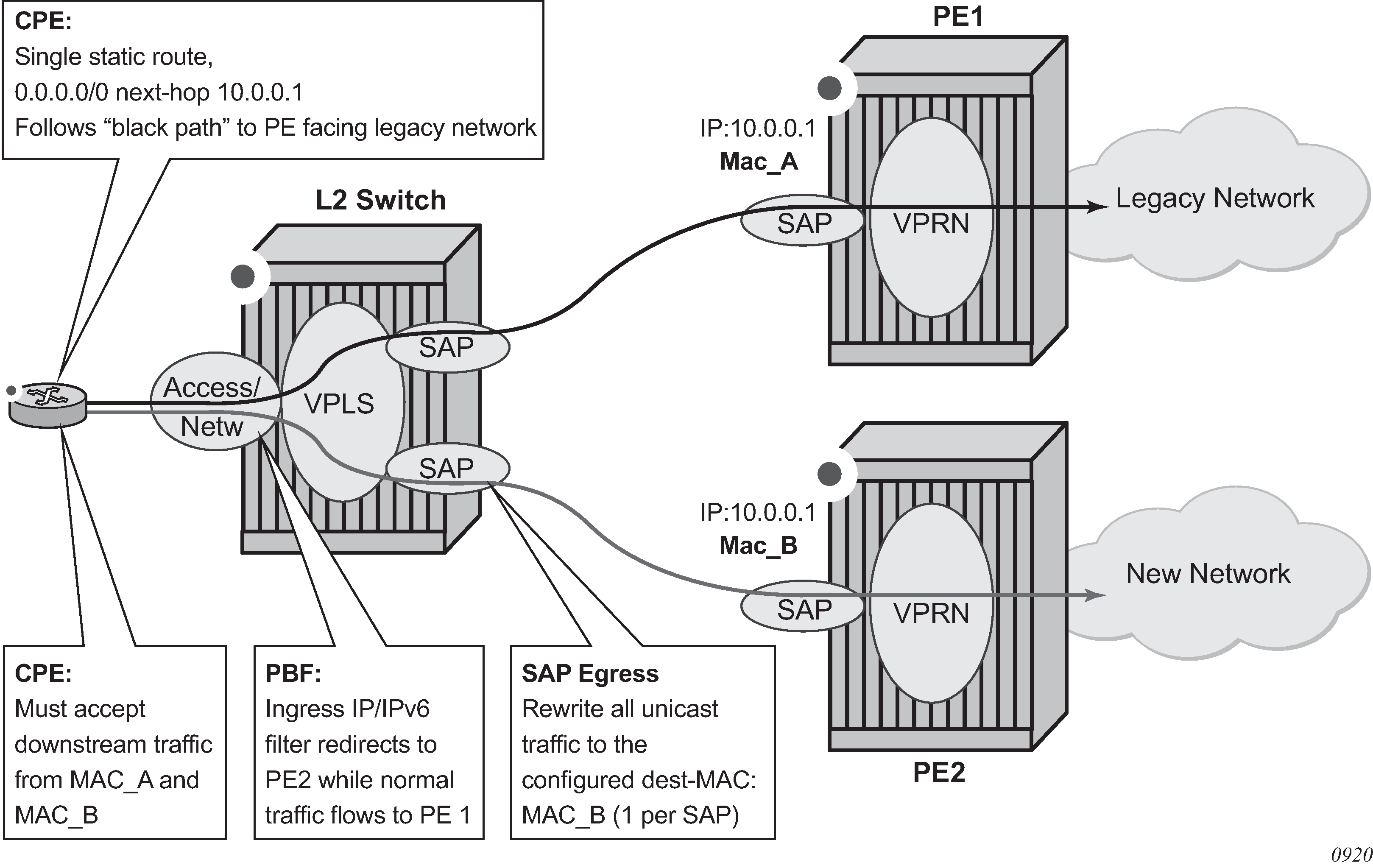 For Layer 2, either an IPv4/IPv6 or MAC filter policy can be applied. For Layer 3 and network interfaces, an IPv4/IPv6 policy can be applied. For R-VPLS service, a Layer 2 filter policy can be applied to Layer 2 forwarded traffic and a Layer 3 filter policy can be applied to Layer 3 routed traffic. For dual-stack interfaces, if both IPv4 and IPv6 filter policies are configured, the policy applied are based on the outer IP header of the packet. Non-IP packets do not affect an IP filter policy, so the default action in the IP filter policy do not apply to these packets. Egress IPv4 QoS-based classification criteria are ignored when egress MAC filter policy is configured on the same interface.