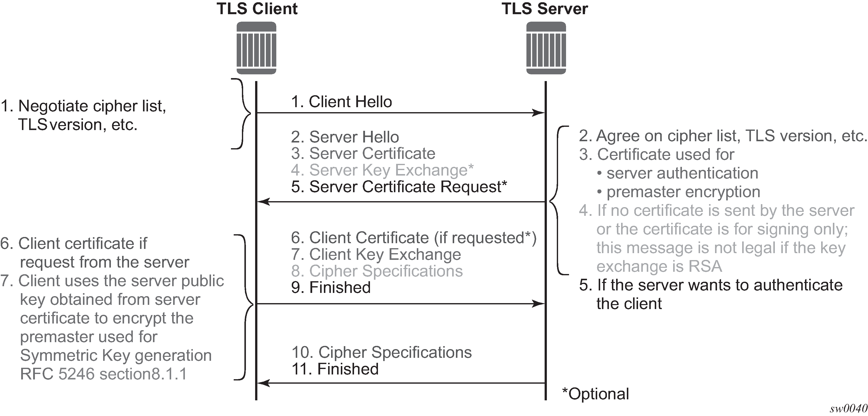 The TLS protocol is used for authentication. It allows the server to authenticate the client via PKI. If the server requests authentication from the client, the client response must provide an X.509v3 certificate that the server can authenticate using the digital signature of its client. The SR OS supports the configuration of an X.509v3 certificate for TLS clients. When the server requests a certificate using the Hello message, the client sends a client certificate message to transmit its certificate to the server.