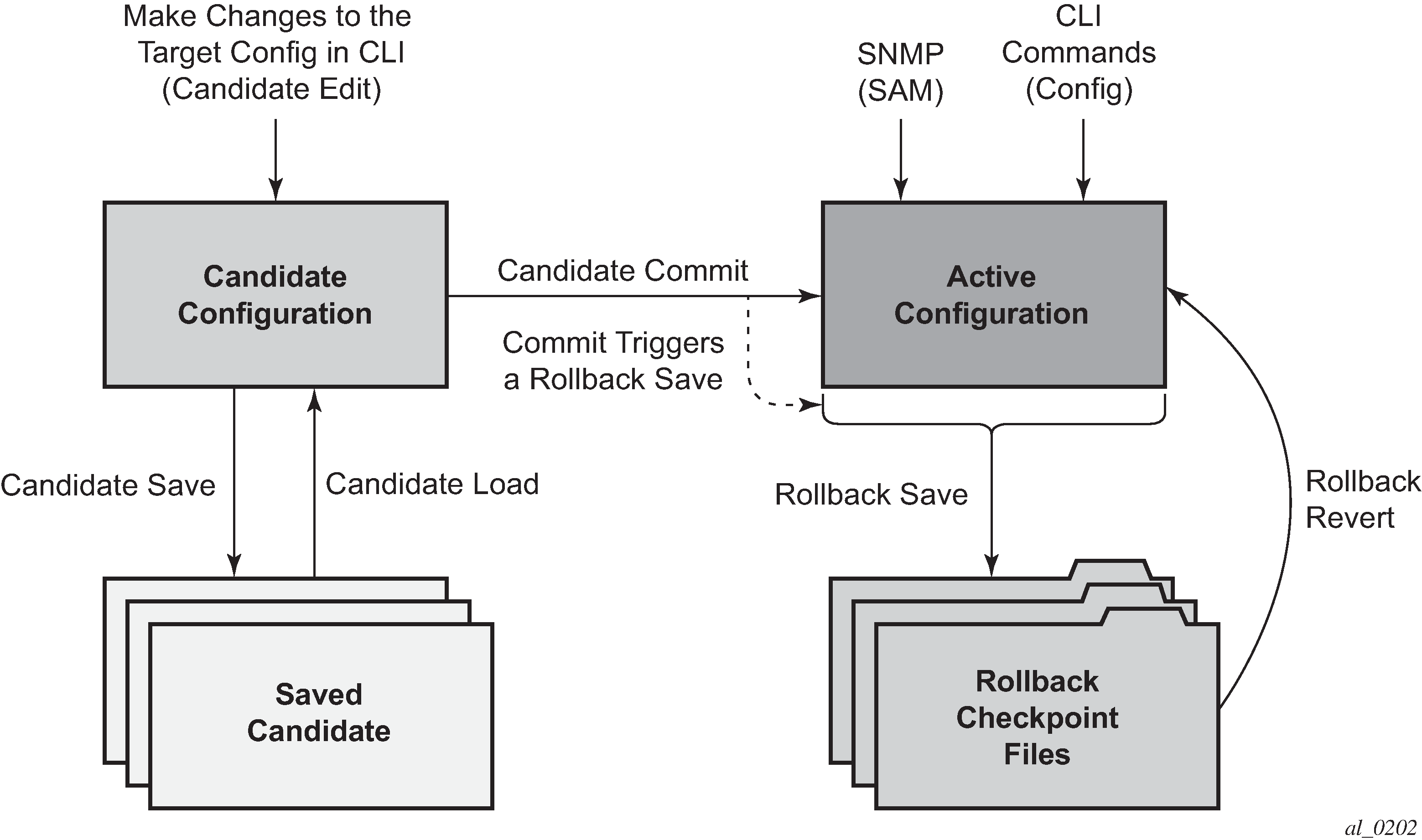 The transactional configuration and configuration rollback functions combine to provide the operational model depicted in the following figure.