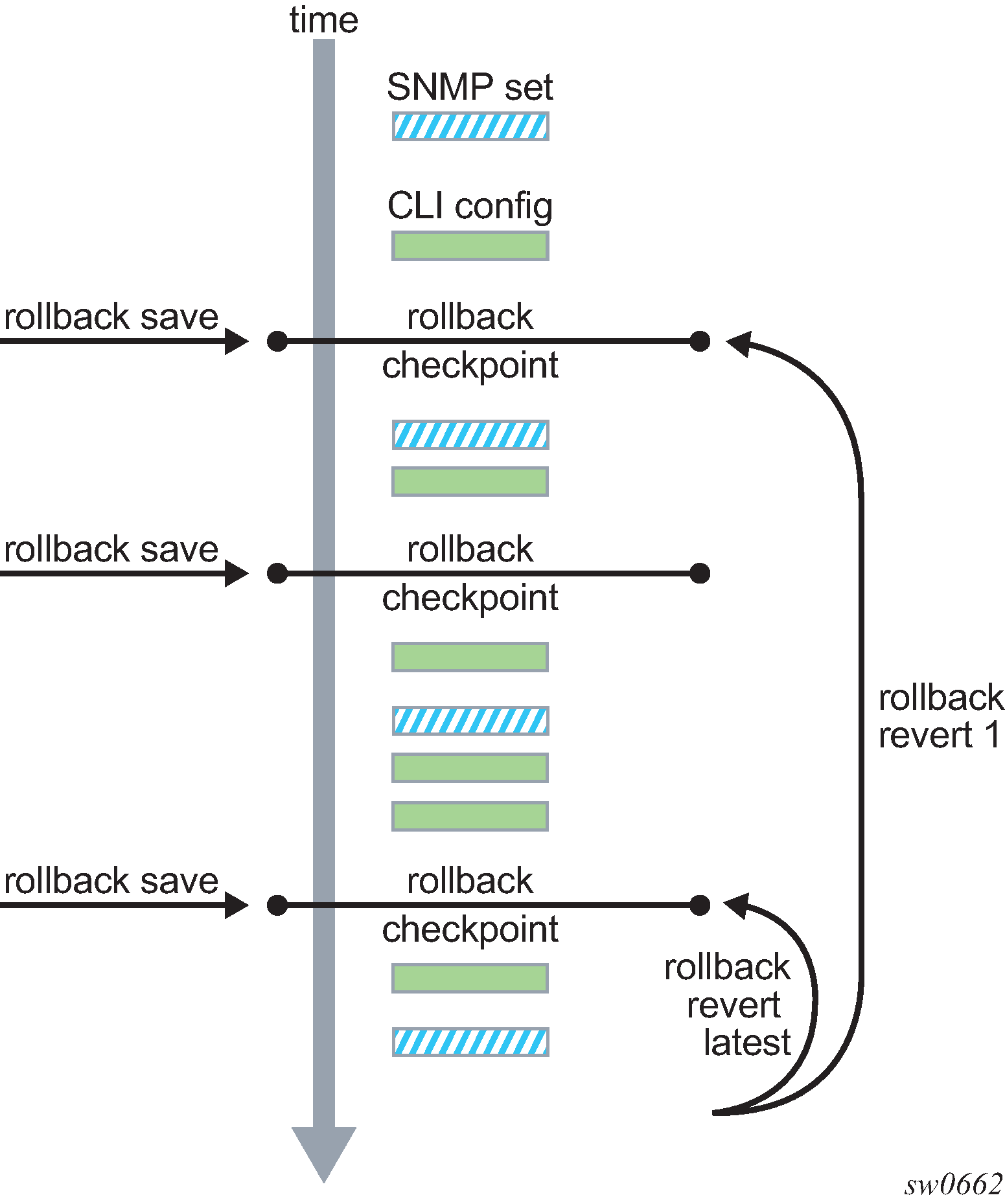 When the router is doing a rollback revert, SNMP managers see a tmnxSysRollbackStarted trap, then a rapid set of ‟config change” traps, and then finally, the tmnxSysRollbackStatusChange trap.
