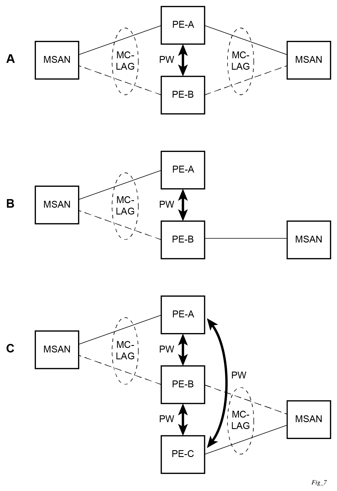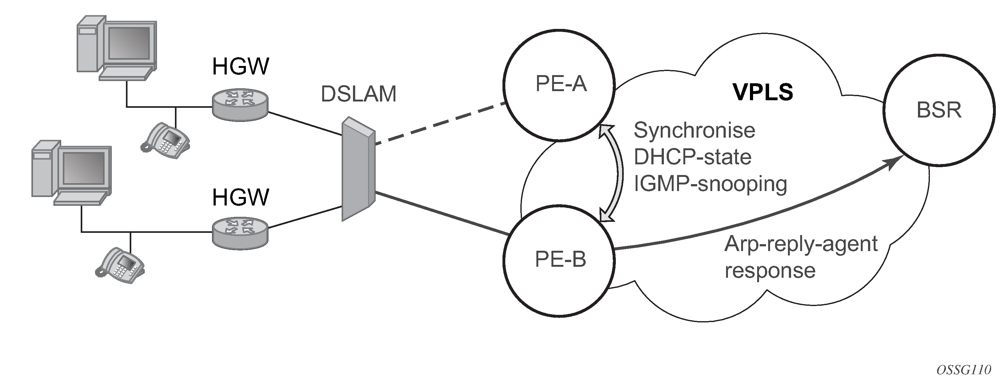 MC-LAG and pseudowire connectivity, PE-A and PE-B implement enhanced subscriber management features based on DHCP-snooping and creating dynamic states for every subscriber-host. As in any point of time there is only one PE active, it is necessary to provide the mechanism for synchronizing subscriber-host state-information between active PE (where the state is learned) and stand-by PE. In addition, VPLS core must be aware of active PE to forward all subscriber traffic to a PE with an active LAG link. The mechanism for this synchronization is outside of the scope of this document.