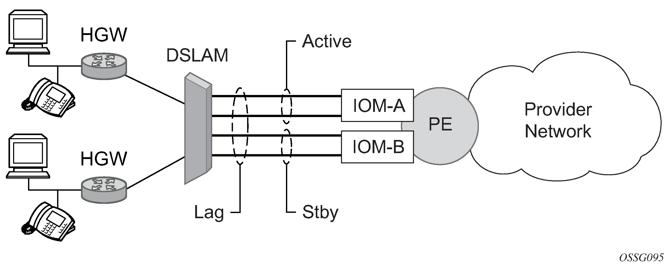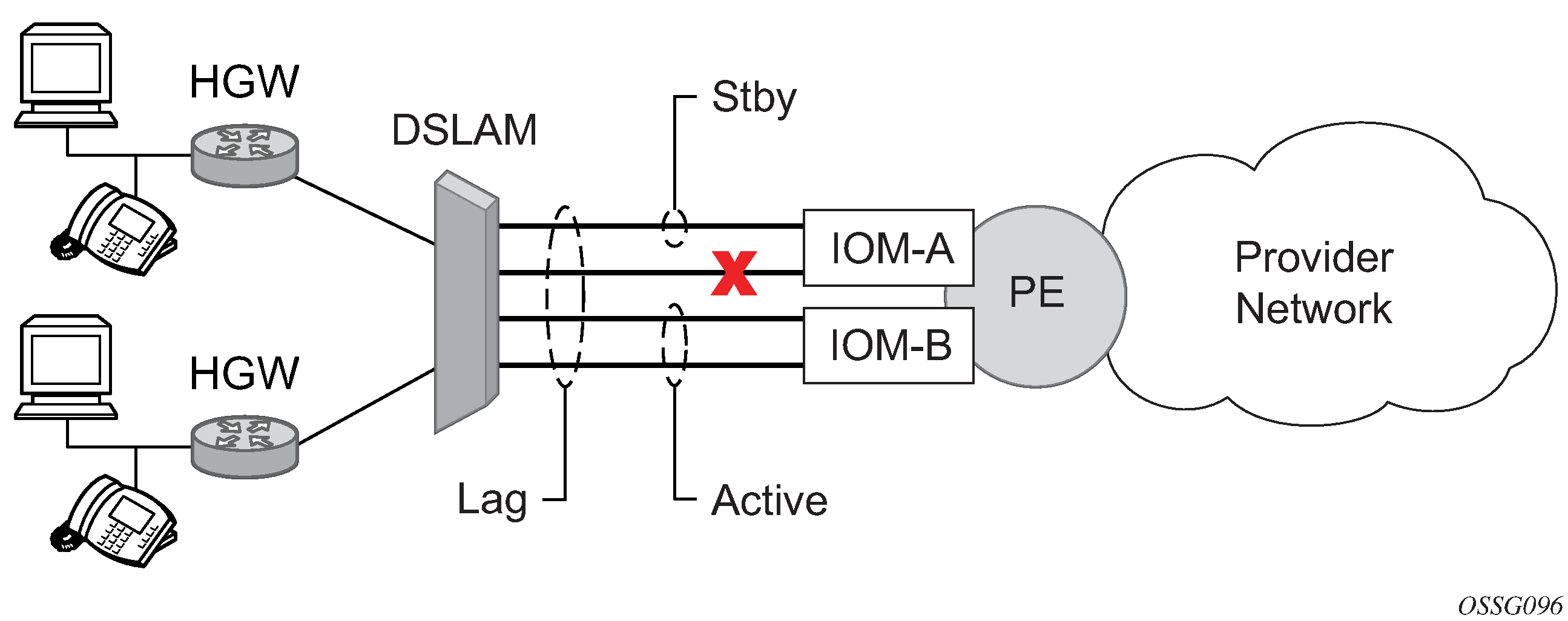 Active/standby LAG operation deployment examples shows how LAG in active/standby mode can be deployed toward a DSLAM access using sub-groups with auto-iom sub-group selection. LAG links are divided into two sub-groups (one per line card).