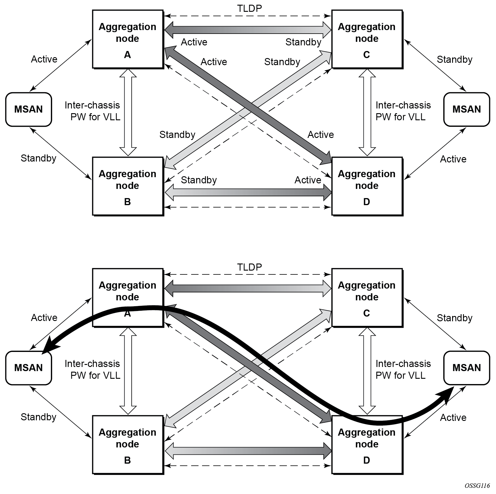 Point-to-Point (P2P) redundant connection through a Layer 2 VPN network shows the connection between two multiservice access nodes (MSANs) across a network based on Layer 2/3 VPN pseudowires. The connection between MSAN and a pair of PE routers is realized by MC-LAG. From an MSAN perspective, a redundant pair of PE routers acts as a single partner in LACP negotiation. At any time, only one of the routers has an active link in a specified LAG. The status of LAG links is reflected in status signaling of pseudowires set between all participating PEs. The combination of active and stand-by states across LAG links as well as pseudowires gives only one unique path between a pair of MSANs.