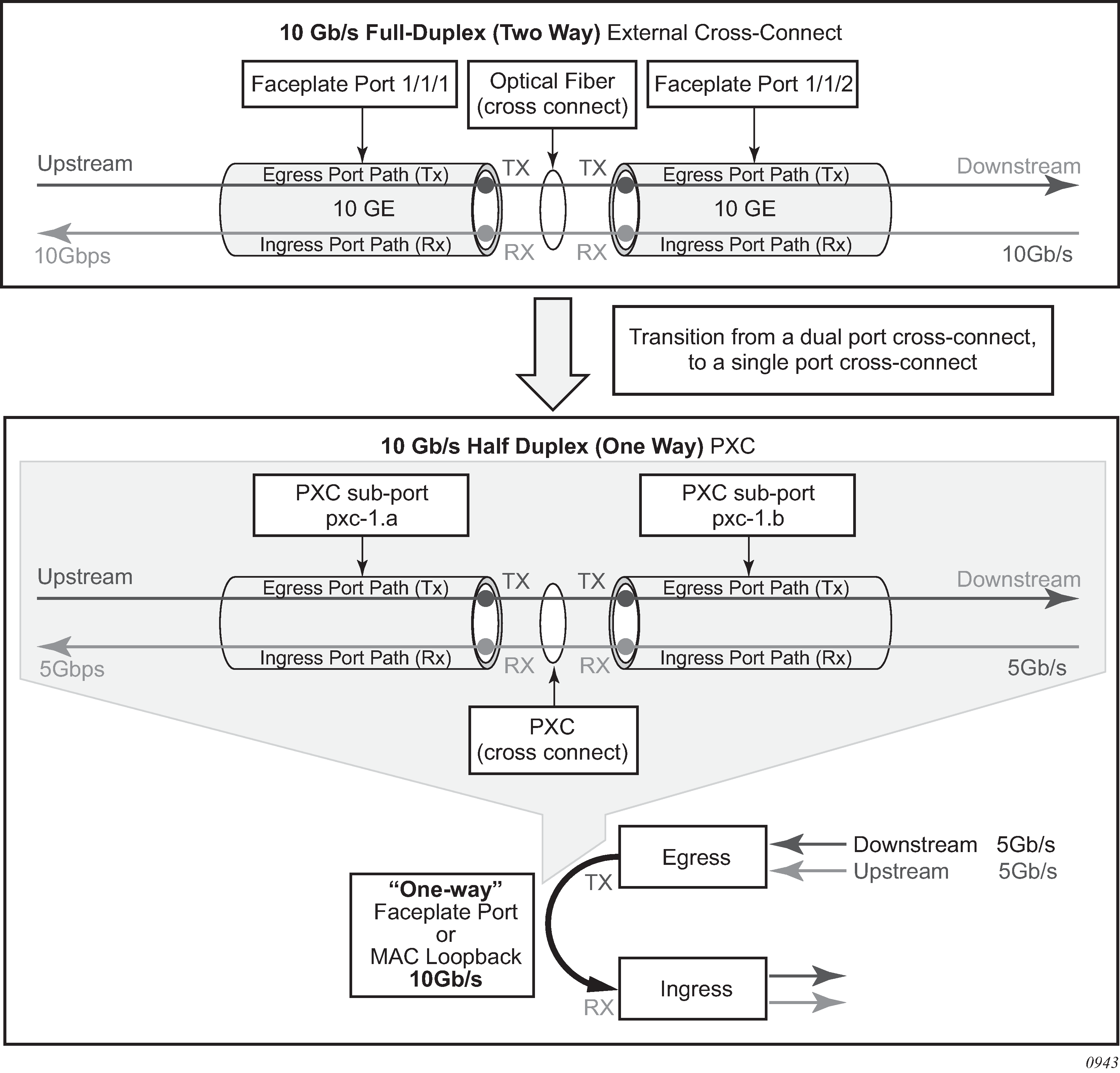 Bidirectional connectivity provided by PXC requires two sub-ports, one in each direction. The router uses these PXC sub-ports as logical configurations to transmit traffic in both directions over a half-duplex (one-way) cross-connect created in the system. As a result, the total bandwidth capacity supported by the mated PXC sub-ports is limited by the bandwidth capacity of the underlying cross-connect (a single faceplate port or a MAC loopback).