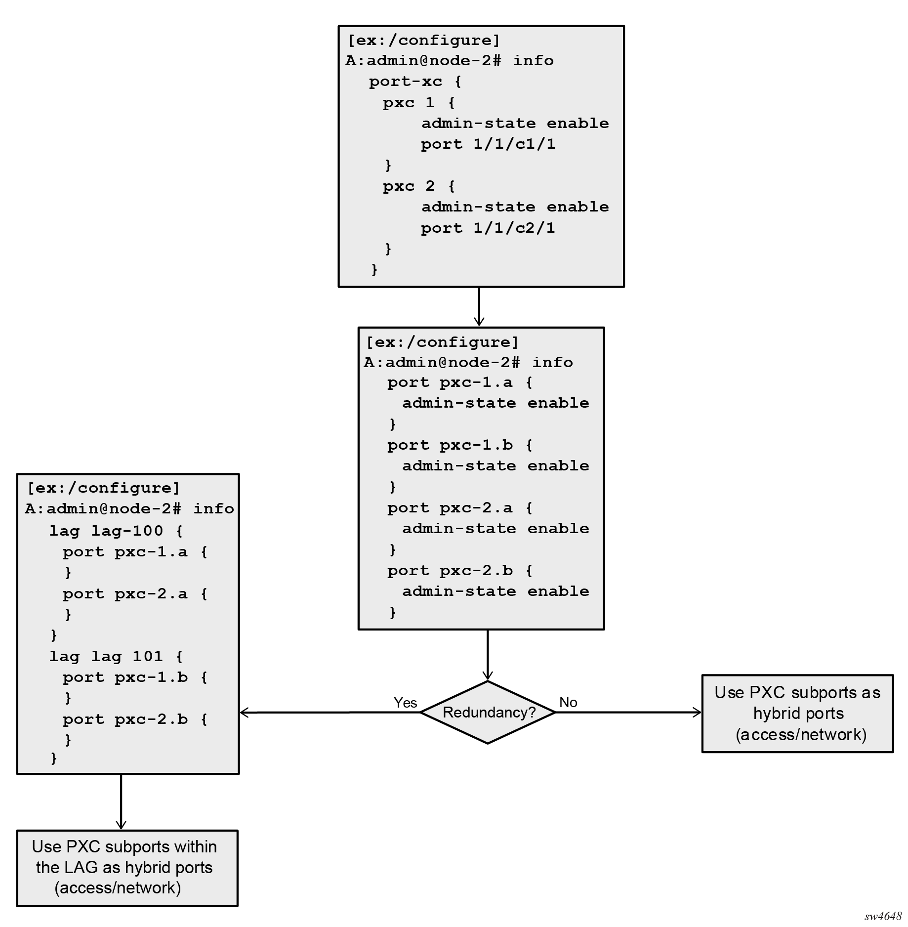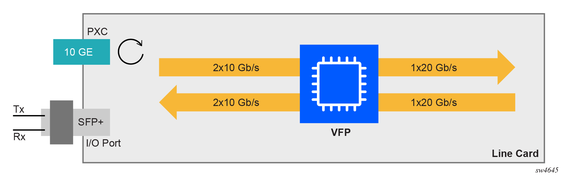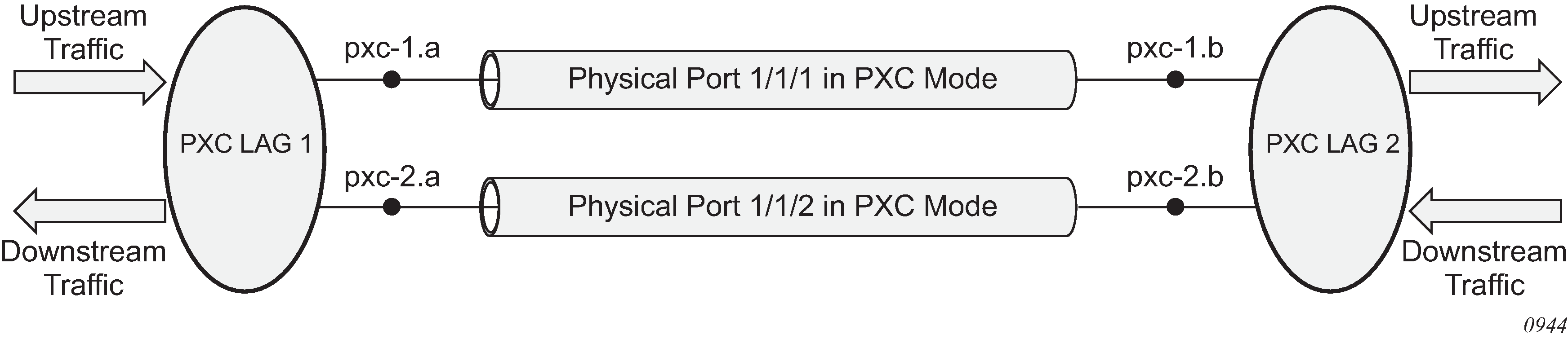 When the faceplate port is allocated to a PXC, it cannot be used outside of the PXC context. For example, an IP interface cannot use the faceplate port directly, or a SAP under a such port cannot be associated with an Epipe or VPLS service.