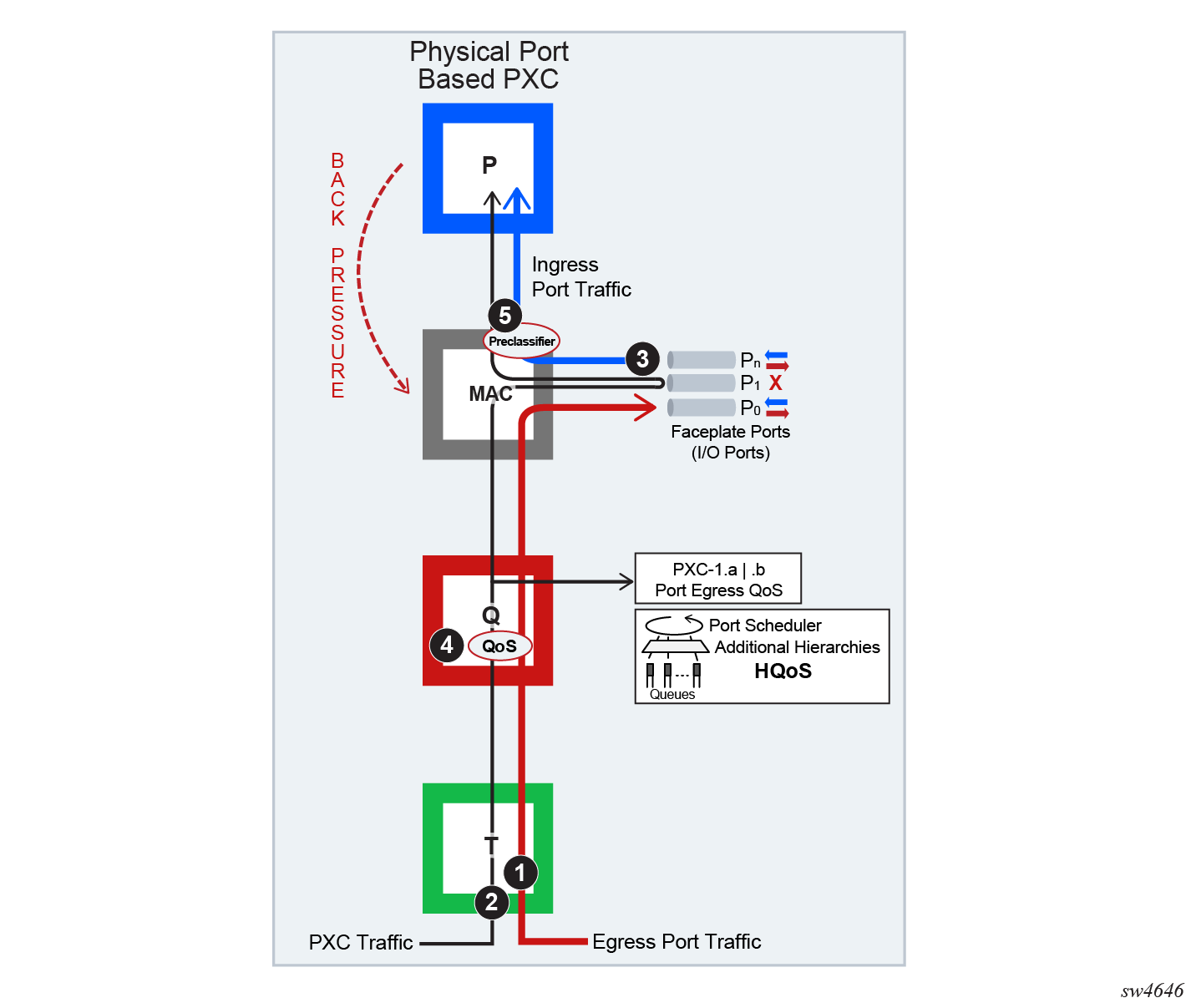The physical port-based PXC configuration Interaction between PXC and non-PXC traffic, shows interaction of the three traffic streams on the forwarding complex with a PXC based on the faceplate ports. To manage congestion, the user-configured input can be exserted in points 4 and 5.