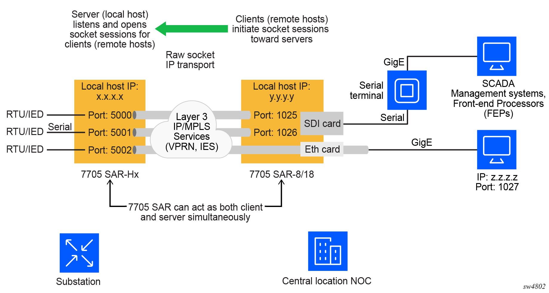 A raw socket local host (acting as a server) at the 7705 SAR-Hx substation listens to TCP sessions that originate at the 7705 SAR-8 Shelf V2/7705 SAR-18 central location network operations center (NOC). The 7705 SAR-8 Shelf V2/7705 SAR-18 at the NOC is connected to two front-end processors (FEPs), one via a serial port and another via an Ethernet port. The serial port on the 7705 SAR-8 Shelf V2/7705 SAR-18 is configured as a remote host (acting as a client) that initiates TCP/UDP sessions toward the RTU at the 7705 SAR-Hx substation when traffic is received from the FEP over the serial port. These TCP/UDP sessions are transported over the IP/MPLS network using IP transport service over an IES or VPRN service. The serial data that is transported over the TCP/UDP session and received at the 7705 SAR-Hx is sent over the serial link toward the RTU. TCP/UDP sessions received from the FEP over the Ethernet port are transported over an IES or VPRN service (that is, there is no need for serial remote host configuration in this case).
