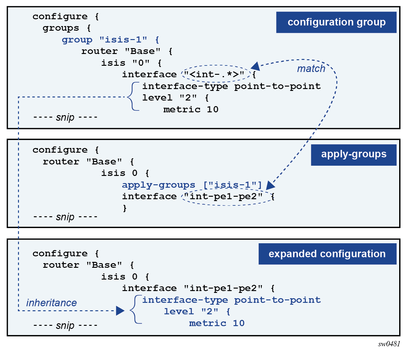 In this example, all backbone IS-IS interface configuration parameters are part of the ‟isis-bb-interface” configuration group. A regular expression match ‟<int-.*>” is used to match on all backbone IS-IS interface names that start with ‟int-‟. The system loopback interface does not match the regular expression, so cannot inherit the configuration elements from the group.