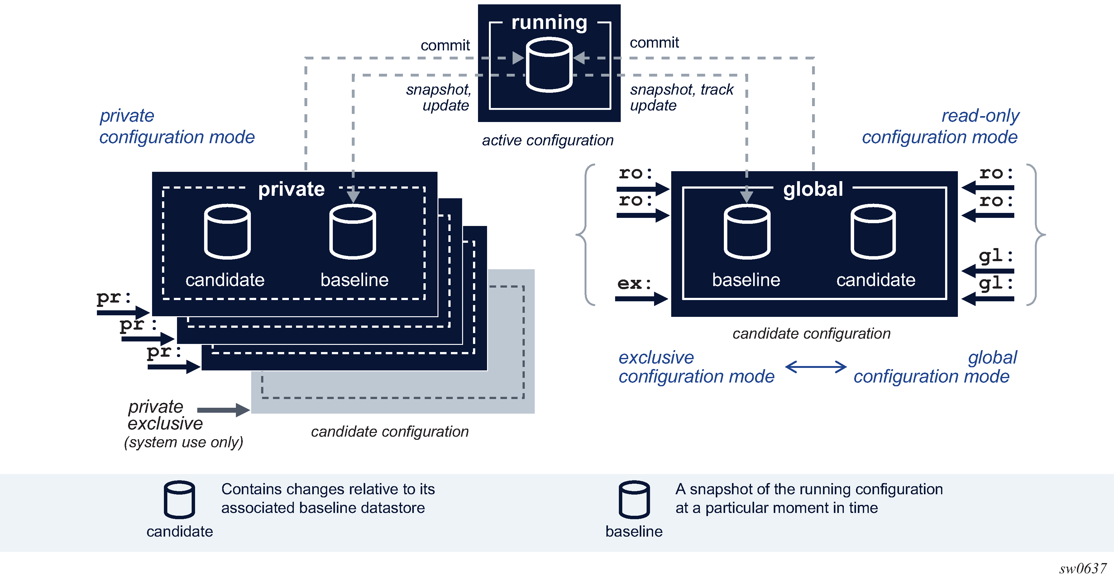 The configuration mode (private, exclusive, global, or read-only) determines the interaction with other simultaneous configuration sessions. Candidate configuration modes are detailed in Candidate configuration modes.