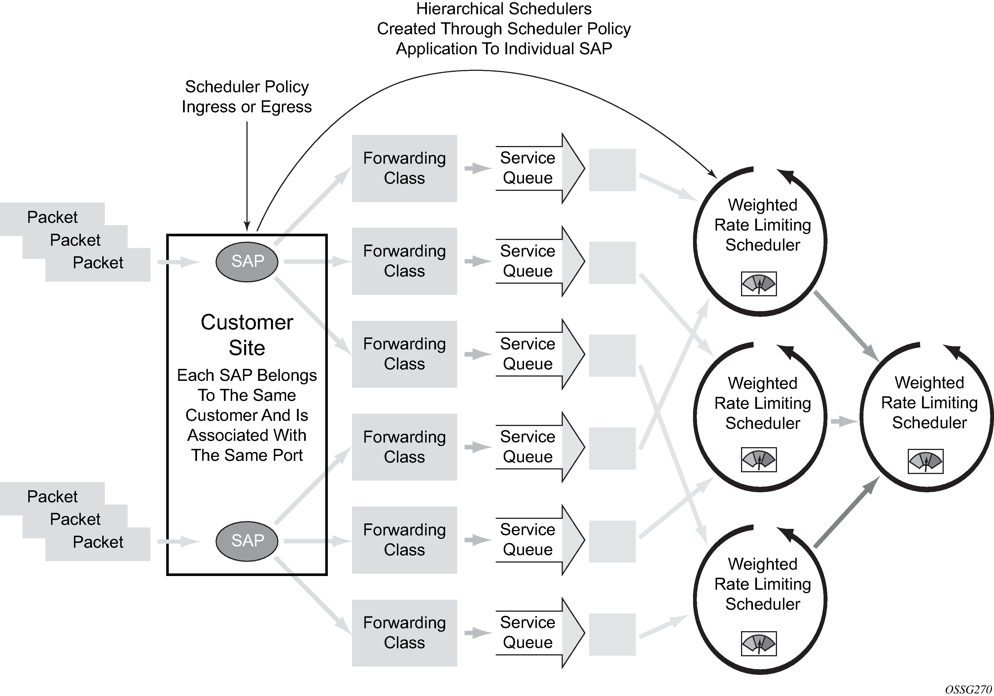 The use of the hierarchical scheduler policies is often referred to as hierarchical QoS or HQoS on the SR OS.