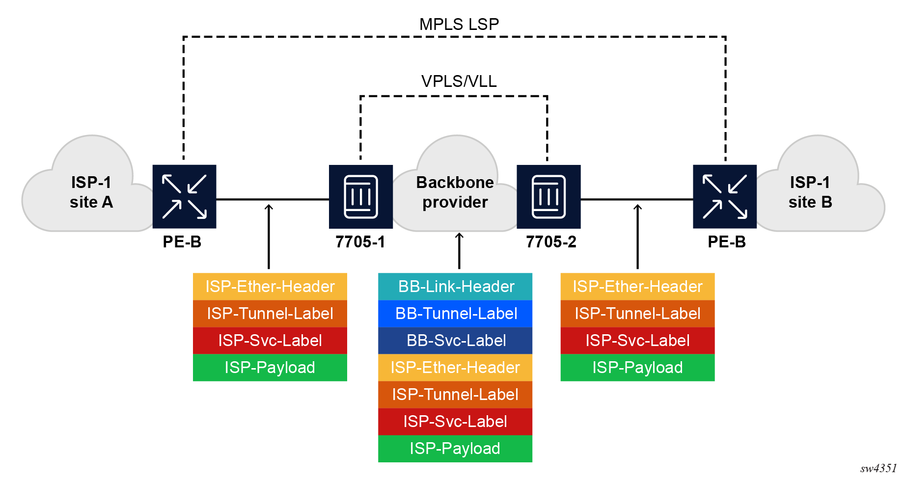 In the Nokia service router service model, a service is provisioned on the provider-edge (PE) equipment. Service data is encapsulated, then sent in a service tunnel to the far-end Nokia service router where the service data is delivered.