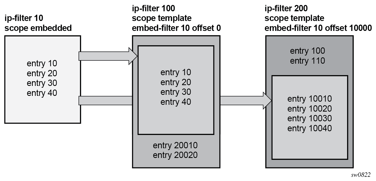 An embedded filter defines a common set of policy rules that can then be used (embedded) by other exclusive or template filters in the system. This allows optimized management of filter policies.