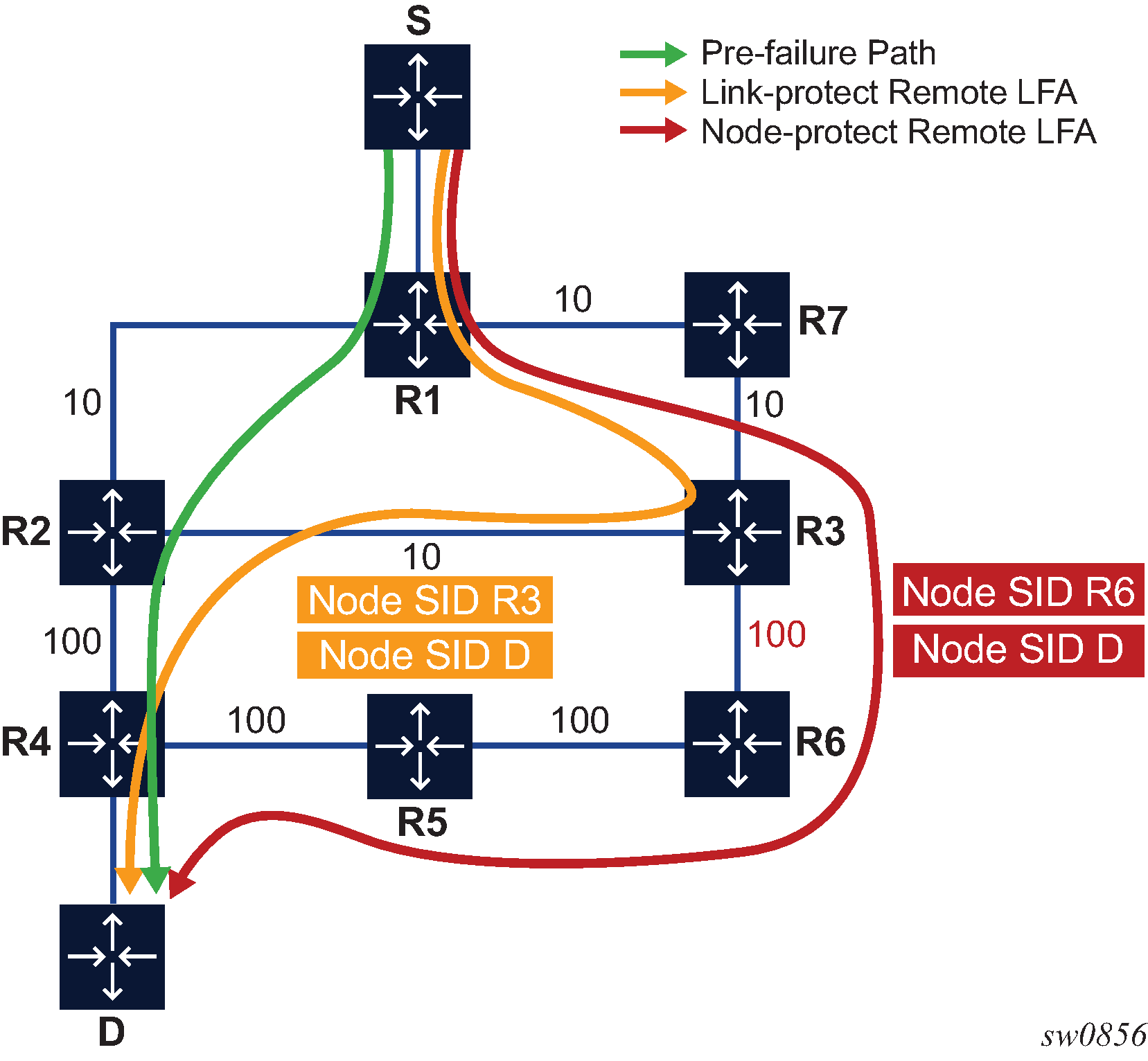 Segment routing provides the remote LFA feature, which expands the coverage of LFA by computing and automatically programming SR tunnels that are used as backup next hops. The SR shortcut tunnels terminate on a remote alternate node that provides loop-free forwarding for packets with resolved prefixes. When the loopfree-alternates option is enabled in an IS-IS or OSPF instance, SR tunnels are protected with an LFA backup next hop. If the prefix of a specific SR tunnel is not protected by the base LFA, the remote LFA automatically computes a backup next hop using an SR tunnel if the remote-lfa option is also enabled in the IGP instance.
