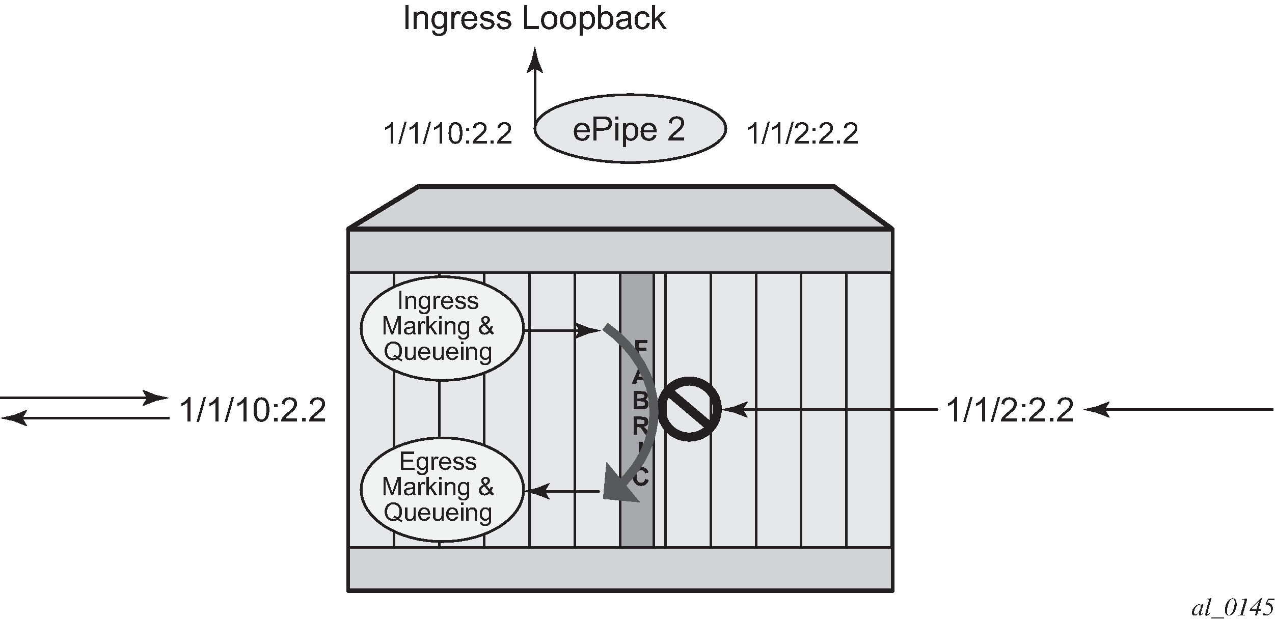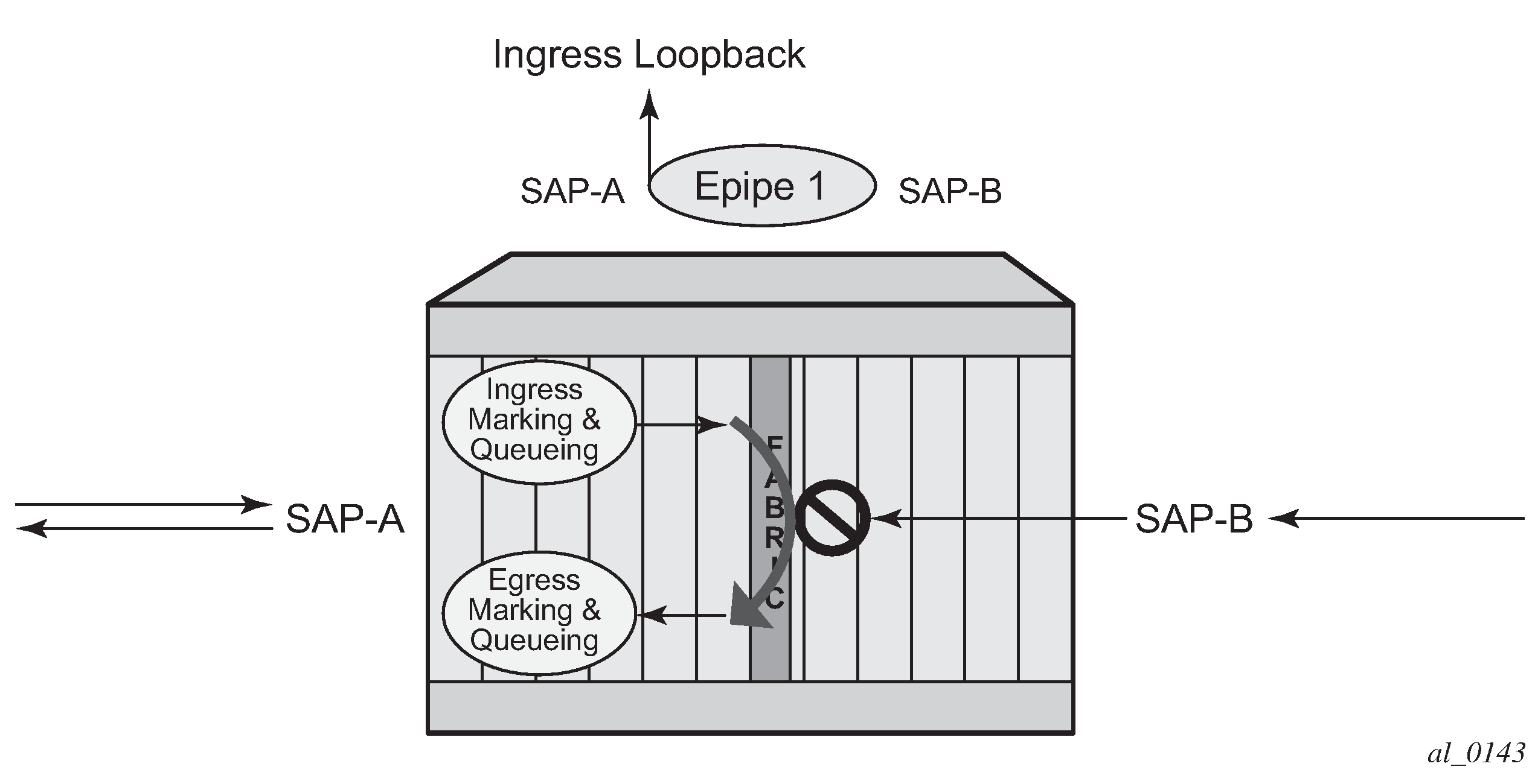 Essentially an ingress loopback function isolates the SAP or MPLS SDP binding from the rest of the service. Ingress loopback packet processing uses a simple Epipe service example to show the various touch points for a packet that is processed by an ingress loopback as it moves through the network element.