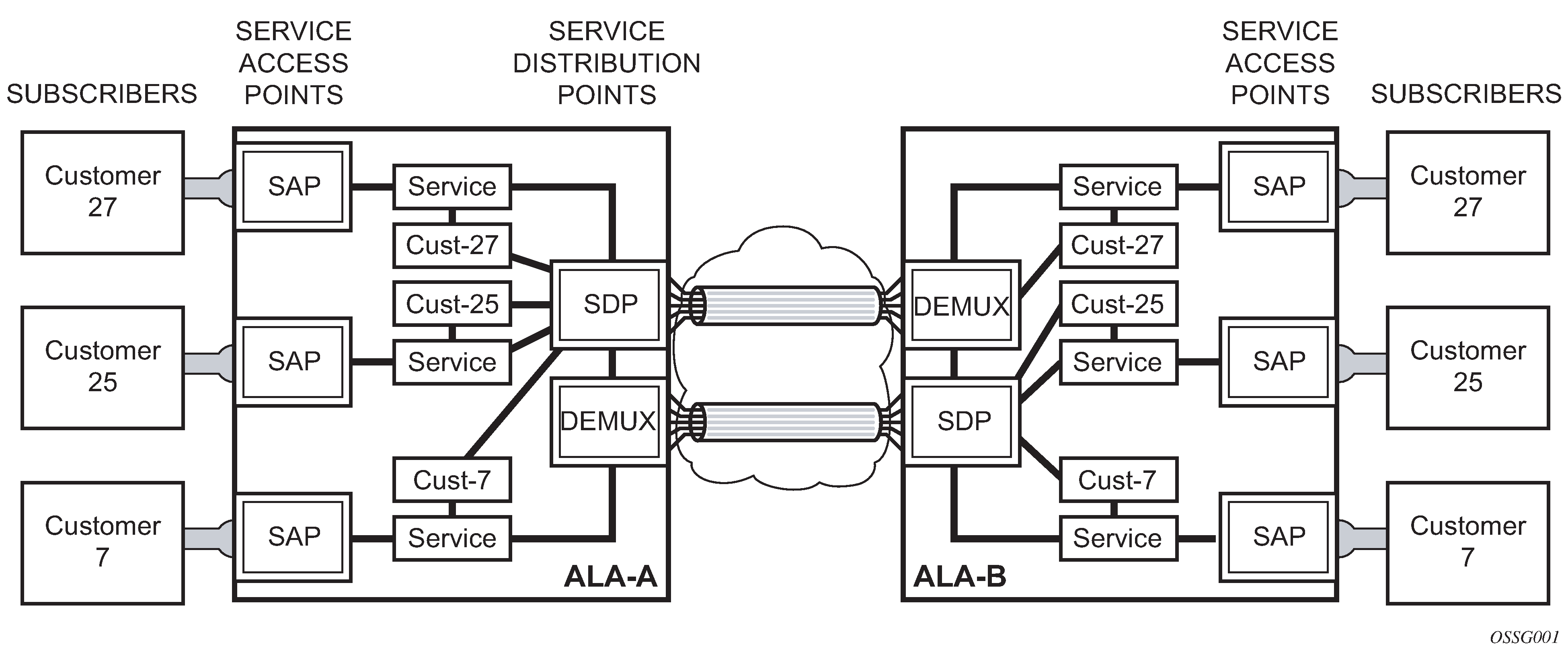 Depending on the encapsulation, a physical port or channel can have more than one SAP associated with it. SAPs can only be created on ports or channels designated as ‟access” in the physical port configuration. SAPs cannot be created on ports designated as core-facing ‟network” ports as these ports have a different set of features enabled in software.