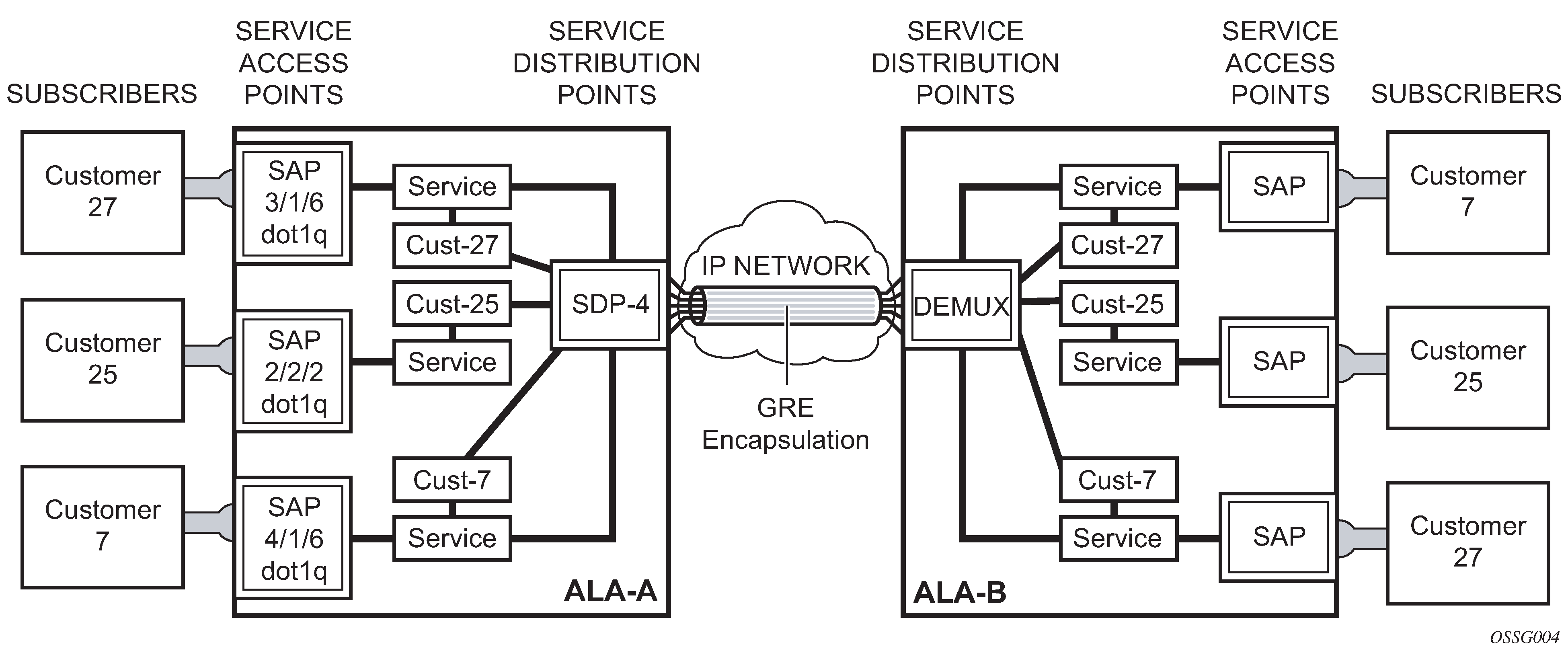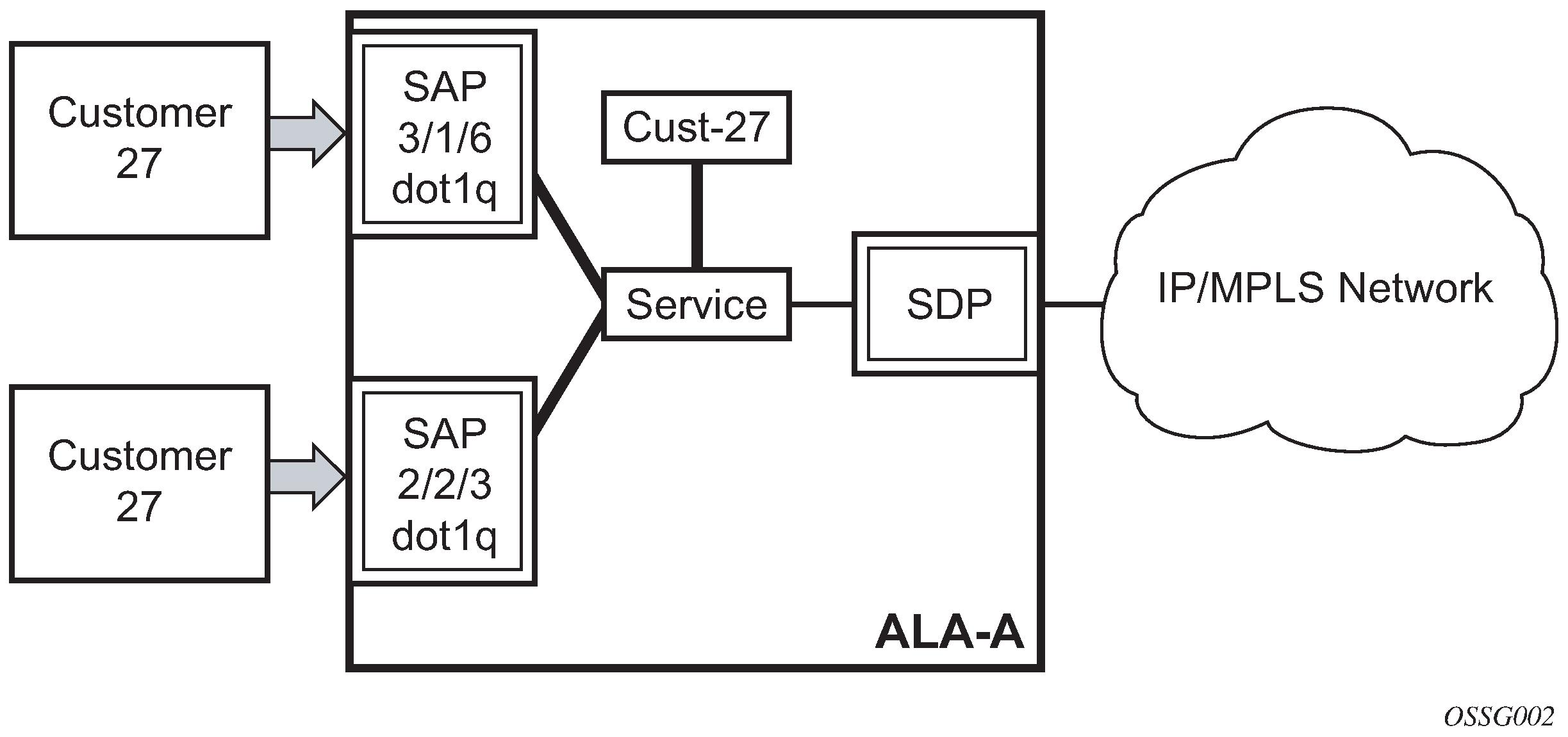 The encapsulation type is an access property of a service Ethernet port or SONET/SDH or TDM channel. The appropriate encapsulation type for the port or channel depends on the requirements to support multiple services on a single port or channel on the associated SAP and the capabilities of the downstream equipment connected to the port or channel. For example, a port can be tagged with IEEE 802.1Q (referred to as dot1q) encapsulation in which each individual tag can be identified with a service. A SAP is created on a specific port or channel by identifying the service with a specific encapsulation ID.
