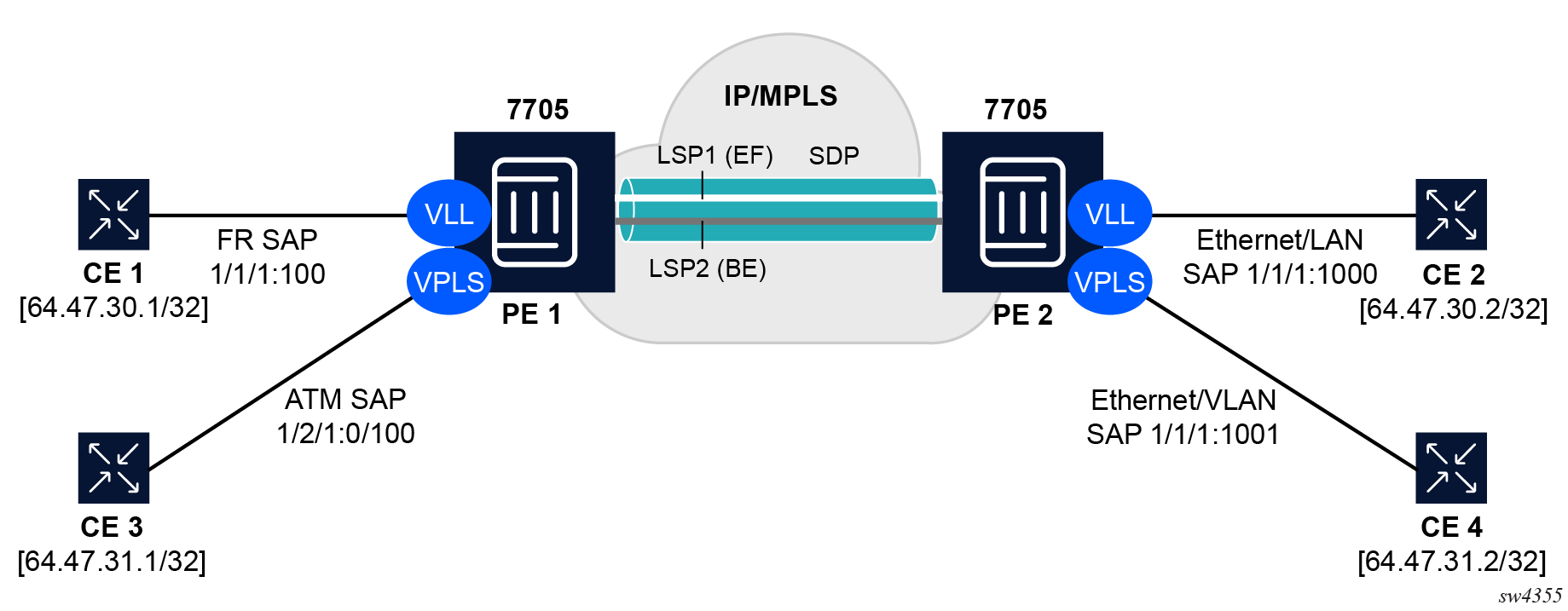 Epipe, PBB Epipe, VPLS, and I-VPLS service constructs support both ingress and egress loopbacks on Ethernet SAPs or MPLS SDP bindings.