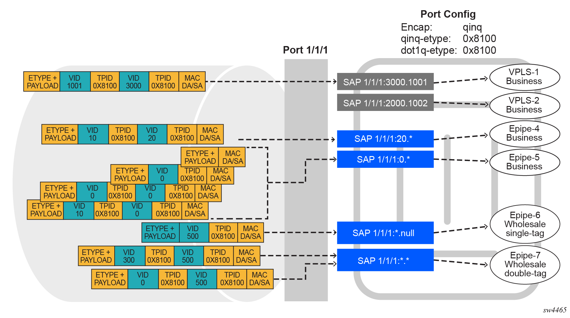 A SAP lookup is performed when a new frame arrives to a QinQ port. This 'lookup' is based on the <outer-tag, inner-tag> values of the frame.