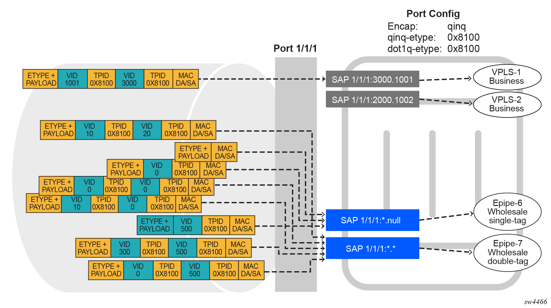 All SAP types (:X.Y, :X.0, :X.*, :0.* or :null.null, :*.null and :*.*) are supported in the same QinQ port (with the exception of :0.* and :null.null being incompatible) and, in the table, they are ordered from the most specific (left side) to the least specific with the following VID matching ranges: