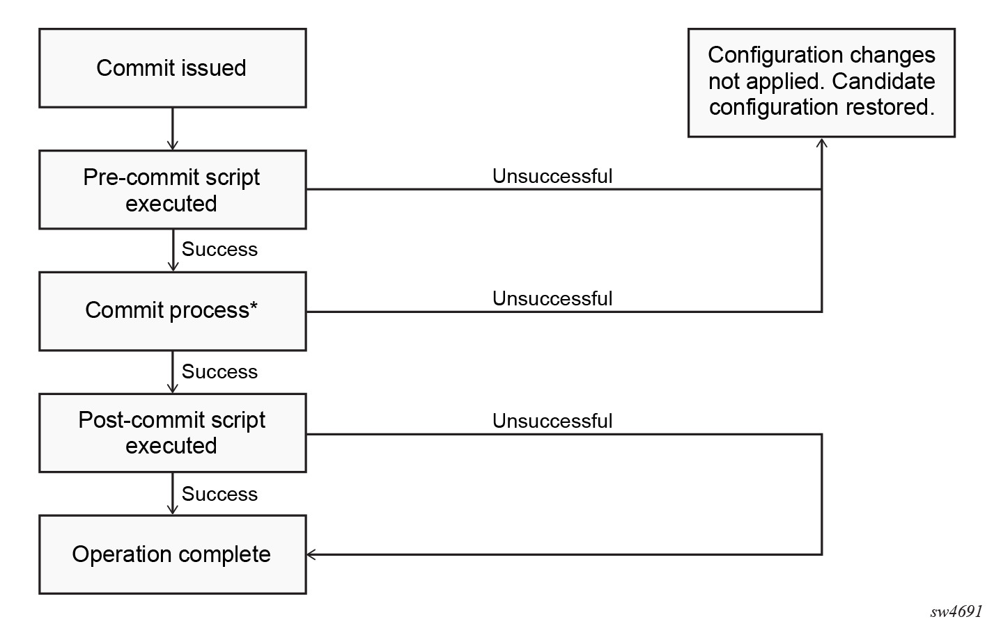 The entire process shown above in the diagram is considered a single commit. Therefore, SR OS locks the running and candidate configurations for the duration of this single commit process. This should be considered when deciding whether to deploy long-running commit scripts.