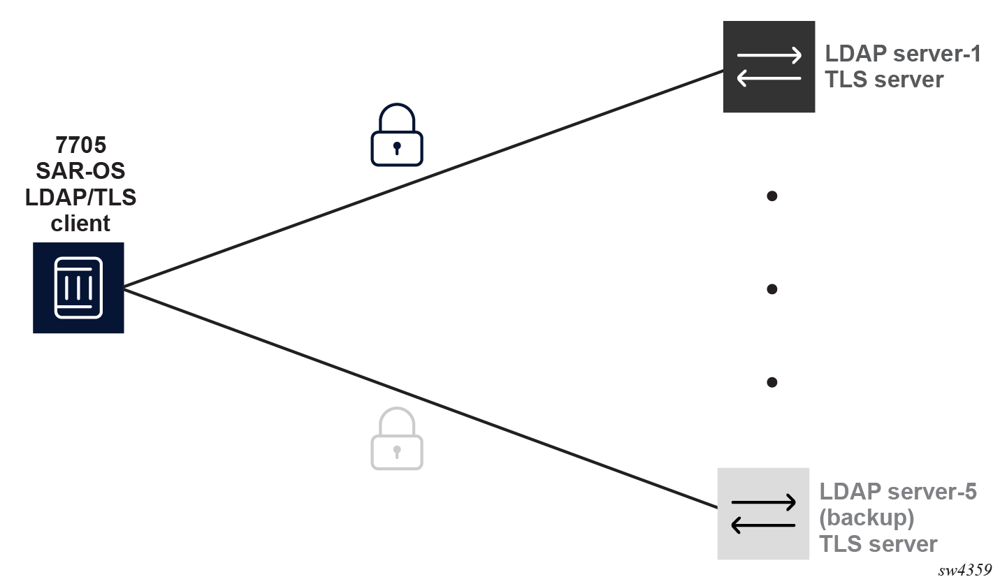 LDAP supports up to five redundant (backup) servers. Depending on the configuration of timeout and retry values, if an LDAP server is found to be out of service or operationally down, the SR OS will switch to the redundant servers. The SR OS will try the next LDAP server in the serred server index.