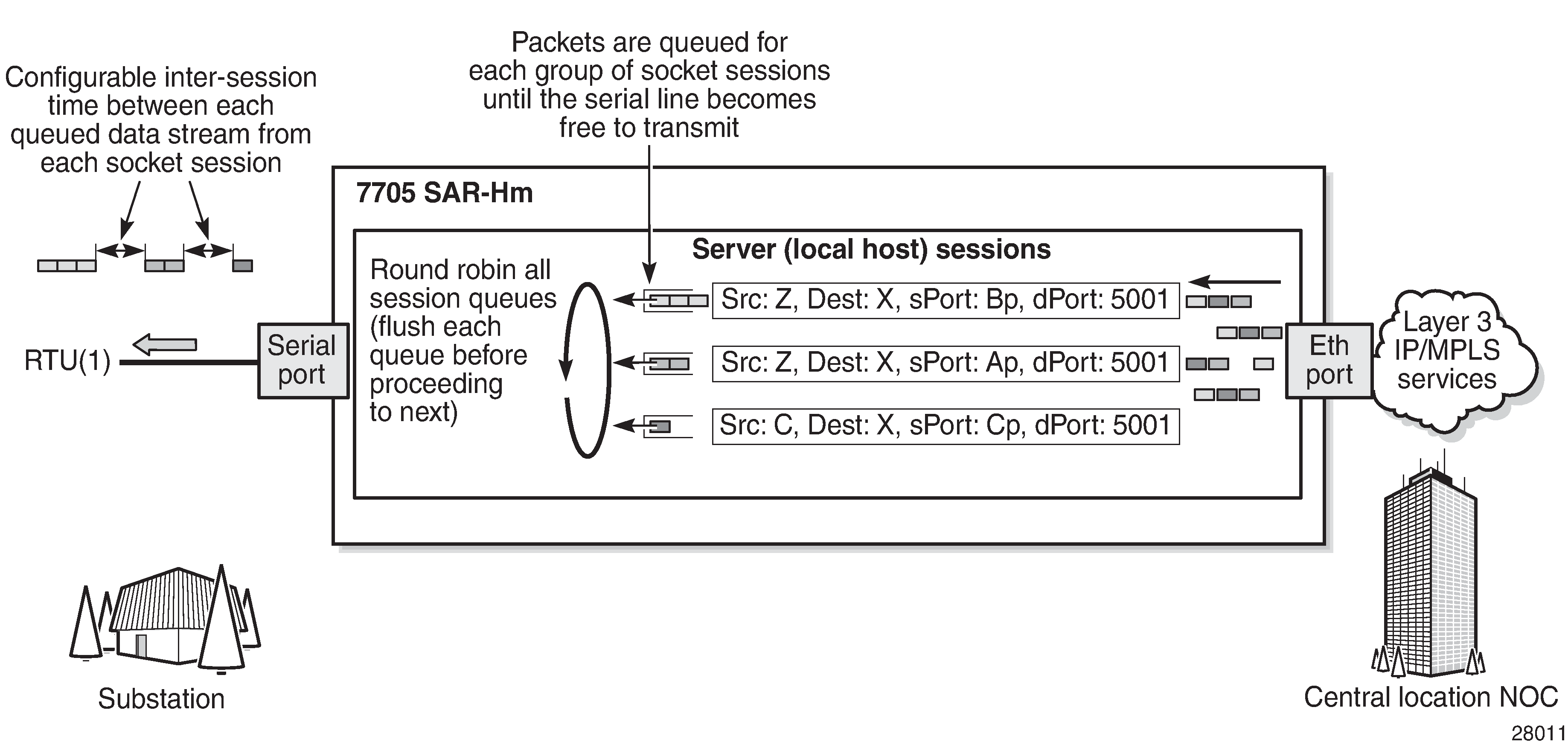 Multiple FEPs can poll a single RTU. If multiple sessions attempt to transmit serial data on the serial port simultaneously, the 7705 SAR-Hm queues packets per session and ensures that all data for one session is sent out before processing another session's data, ensuring that sessions do not overlap one another.