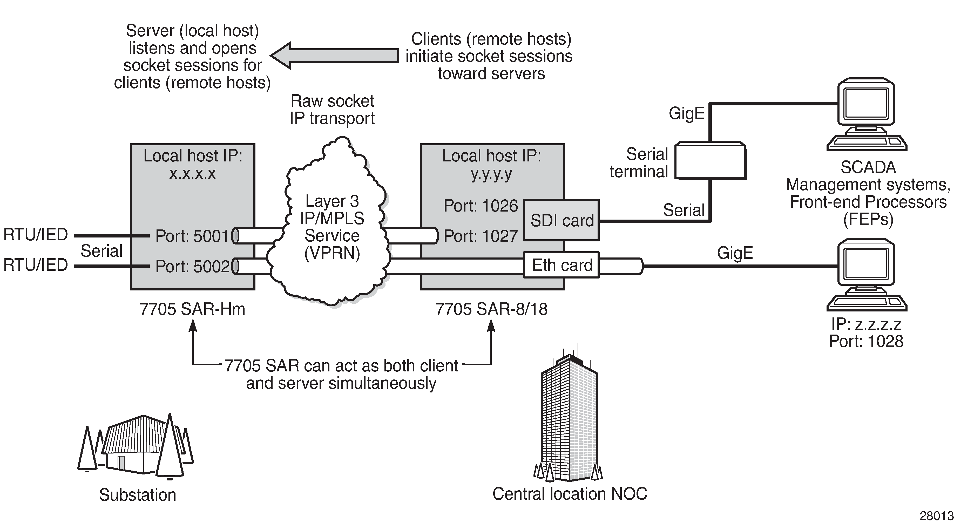 A raw socket local host (acting as a server) at the 7705 SAR-Hm substation listens to TCP sessions that originate at the 7705 SAR-8 or 7705 SAR-18 central location network operations center (NOC). The 7705 SAR-8 or 7705 SAR-18 at the NOC is connected to two front-end processors (FEPs), one via a serial port and another via an Ethernet port. The serial port on the 7705 SAR-8 or 7705 SAR-18 is configured as a remote host (acting as a client) that initiates TCP/UDP sessions toward the RTU at the 7705 SAR-Hm substation when traffic is received from the FEP over the serial port. These TCP/UDP sessions are transported over the IP/MPLS network using IP transport service over a VPRN service. The serial data transported over the TCP/UDP session and received at the 7705 SAR-Hm is then sent over the serial link toward the RTU. TCP/UDP sessions received from the FEP over the Ethernet port are transported over a VPRN service (that is, there is no need for serial port remote host configuration in this case).