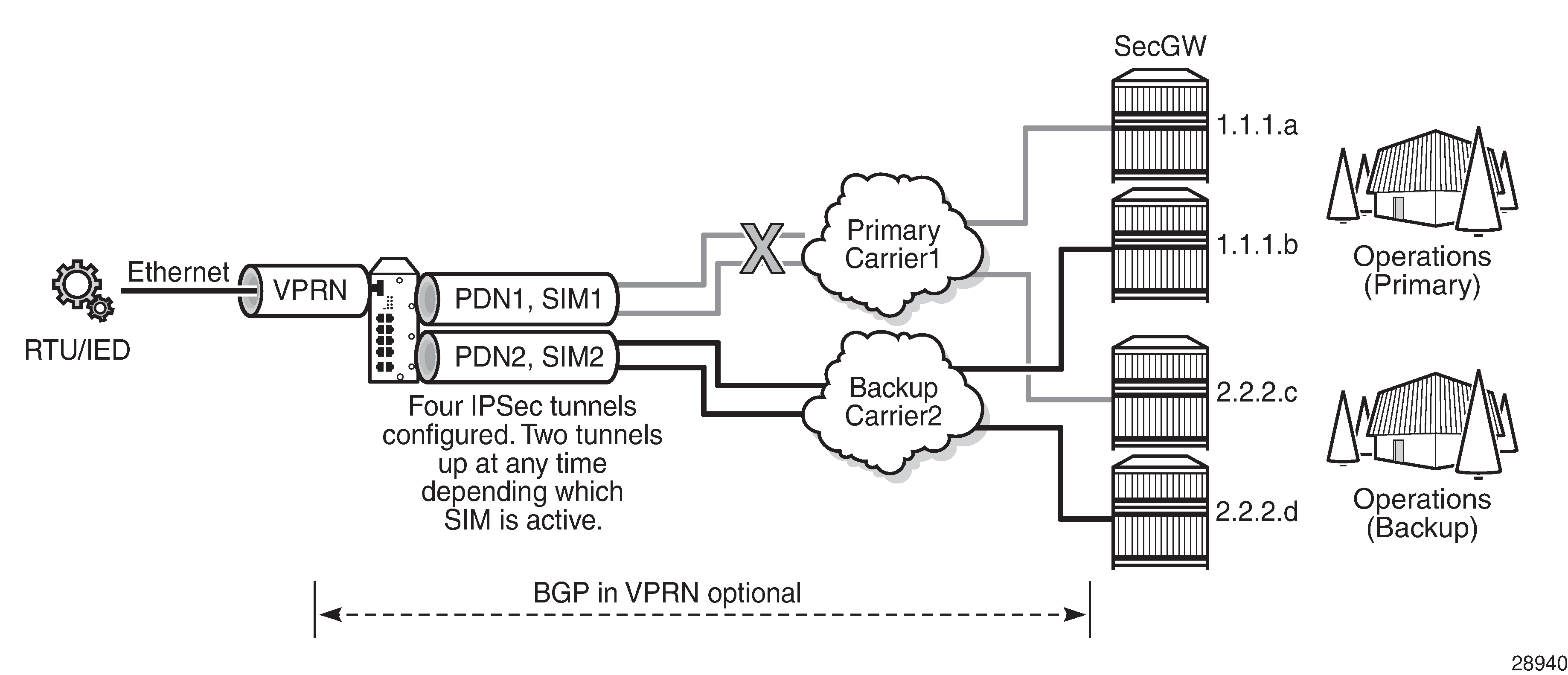 IPSec secured interface over a cellular interface shows an example of an IPSec secured interface deployment over a cellular interface in a dual SIM environment.