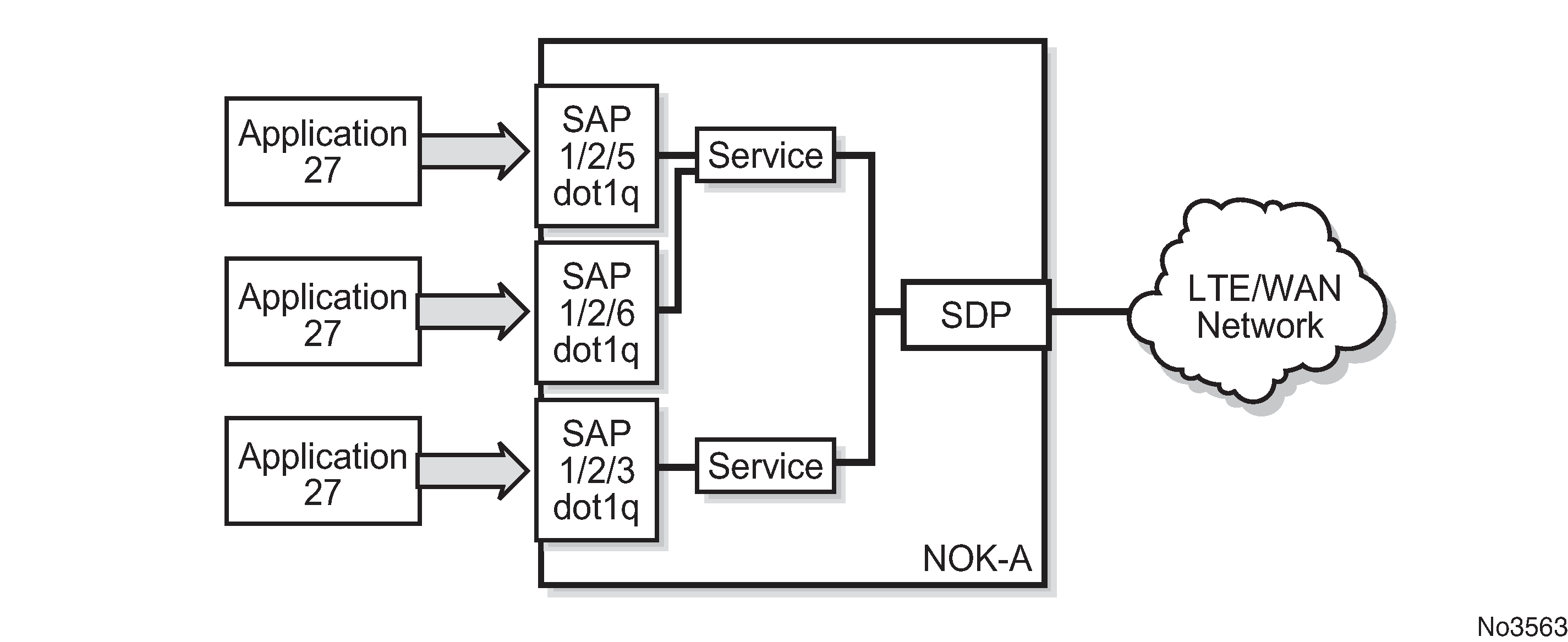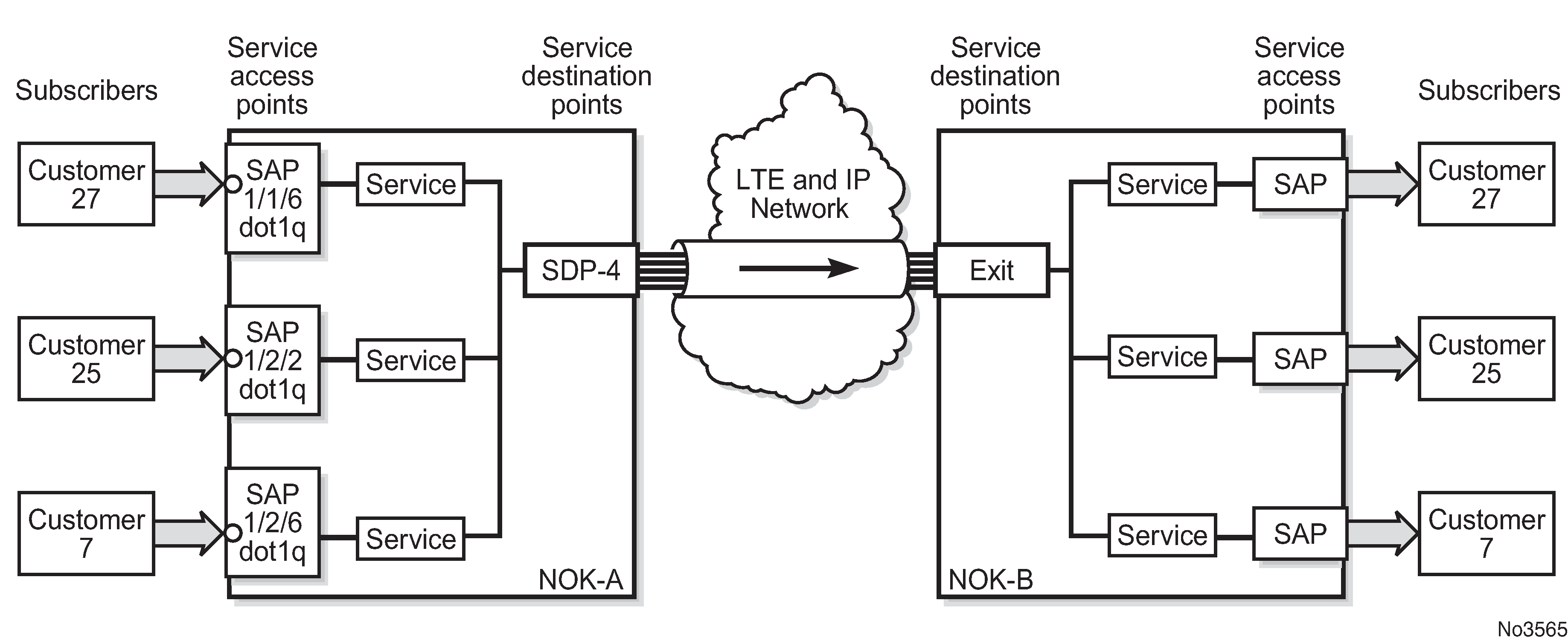 Service entities and the service model shows an example of how the service entities relate to the service model. An application attachment point (for example, an Ethernet port, VLAN, or serial port) connects to a SAP. The SDPs define the entrance and exit points of service tunnels, which carry one-way traffic between the two routers (NOK-A and NOK-B). Configured SDPs are bound to a service or the service is auto-bound which automatically creates tunnels to far-end nodes. The binding of the service to SDPs is the final step in enabling the end-to-end service. In Service entities and the service model, the entrance and exit points are over the wireless interface.