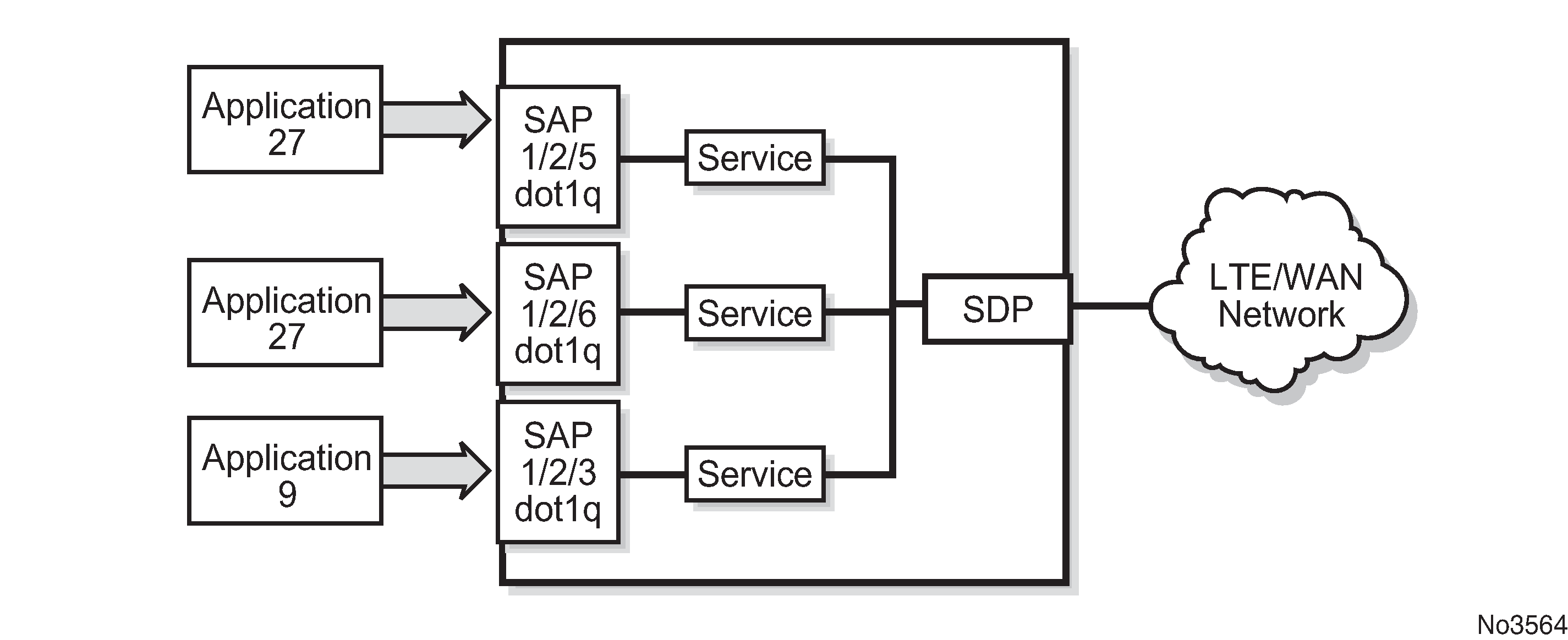 A service access point (SAP) is the point at which a service begins (ingress) or ends (egress) and represents the access point associated with a service. A SAP may be a physical port or a logical entity within a physical port. For example, a SAP may be an Ethernet port or a VLAN that is identified by an Ethernet port and a VLAN tag. Each application service connection is configured to use only one SAP.