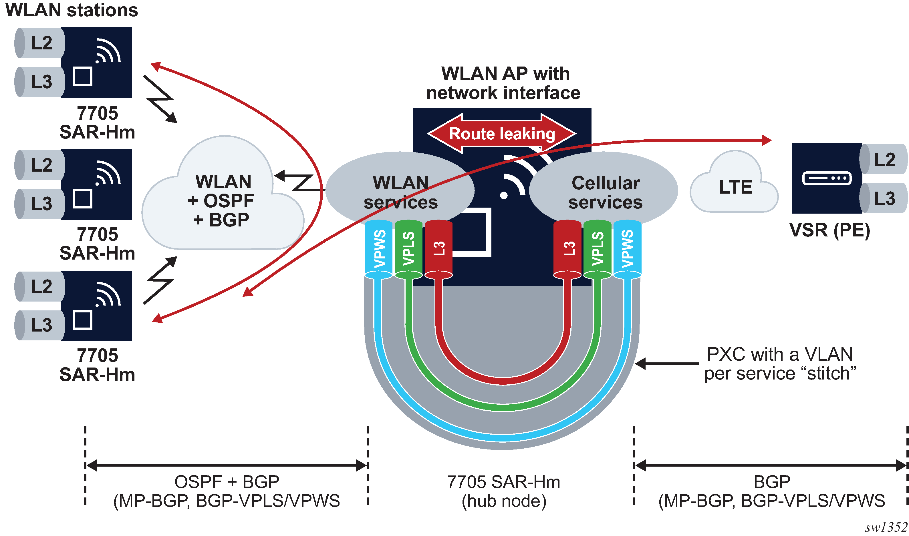 For Layer 3 VPRN services, routes need to be leaked from the WLAN-side VPRN to the cellular-side VPRN. For VPLS, MAC addresses are learned across the PXC port as needed and re-advertised in BGP-VPLS. For VPWS, the stitch is achieved by extending the Epipe service from WLAN to over cellular.