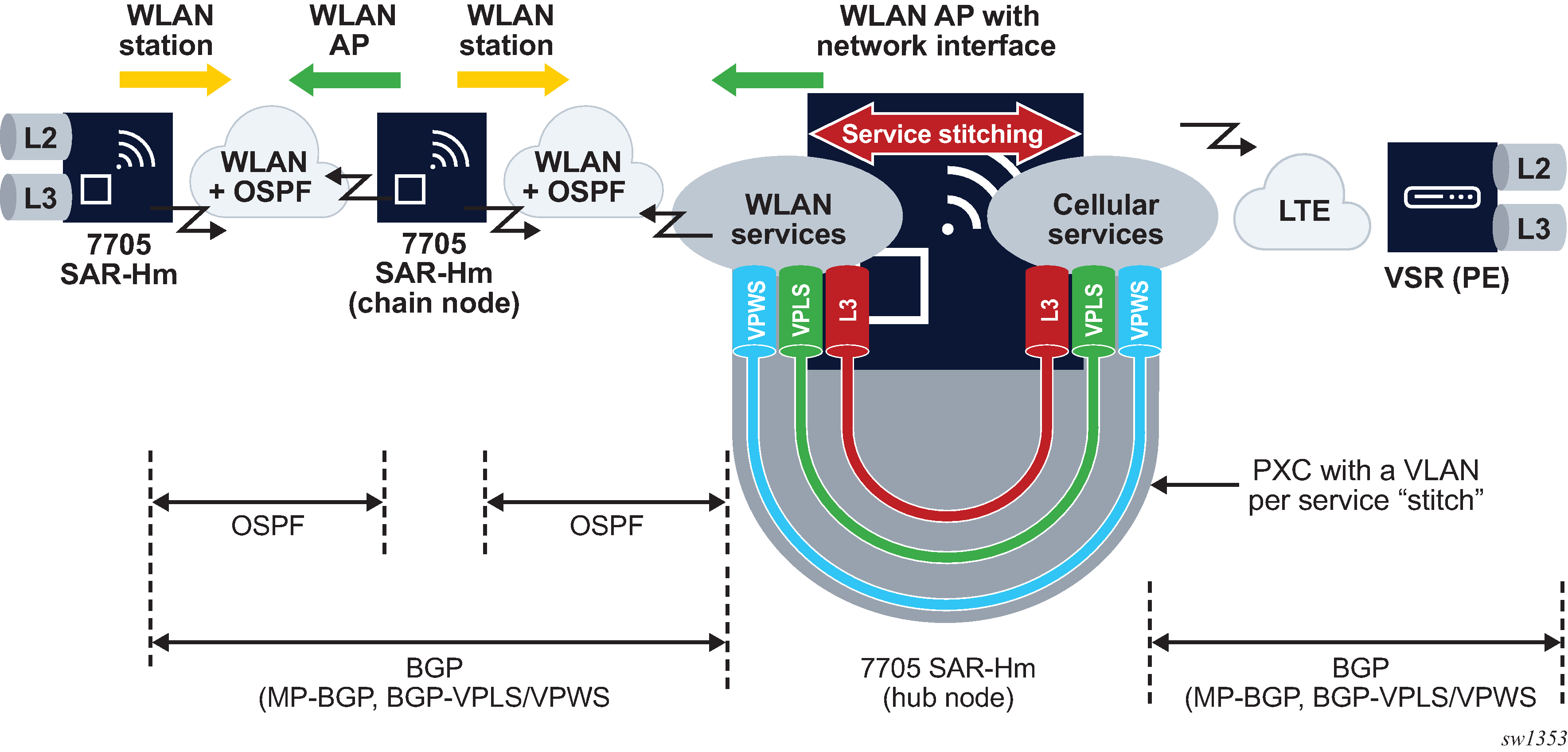 When extending IP/MPLS services over WLAN from the cellular interface, services can be stitched together from the cellular interface to the WLAN AP interface. Service stitching allows operators to create a hub-and-spoke topology from the stitching node to other WLAN stations over the WLAN AP using the same WLAN network.